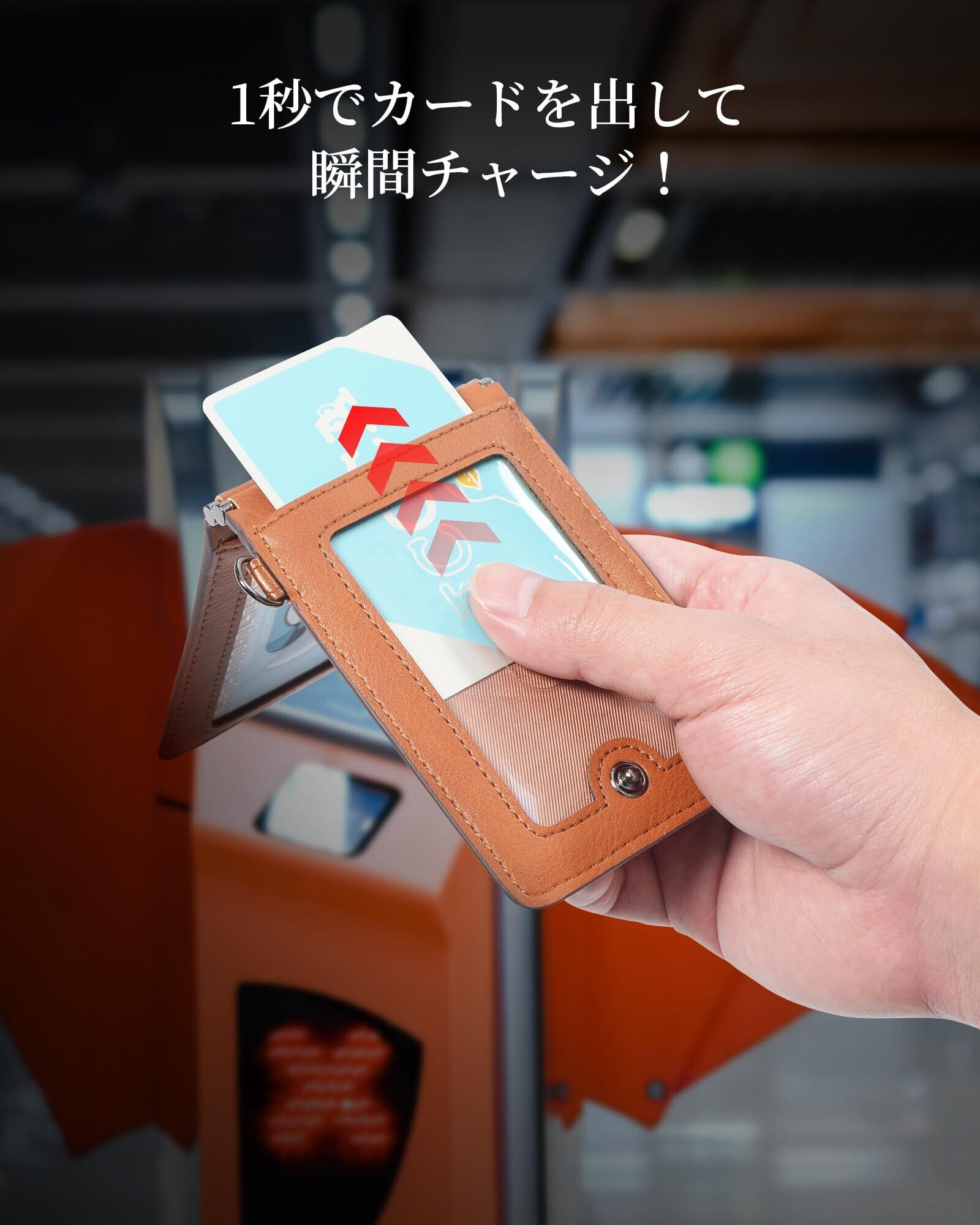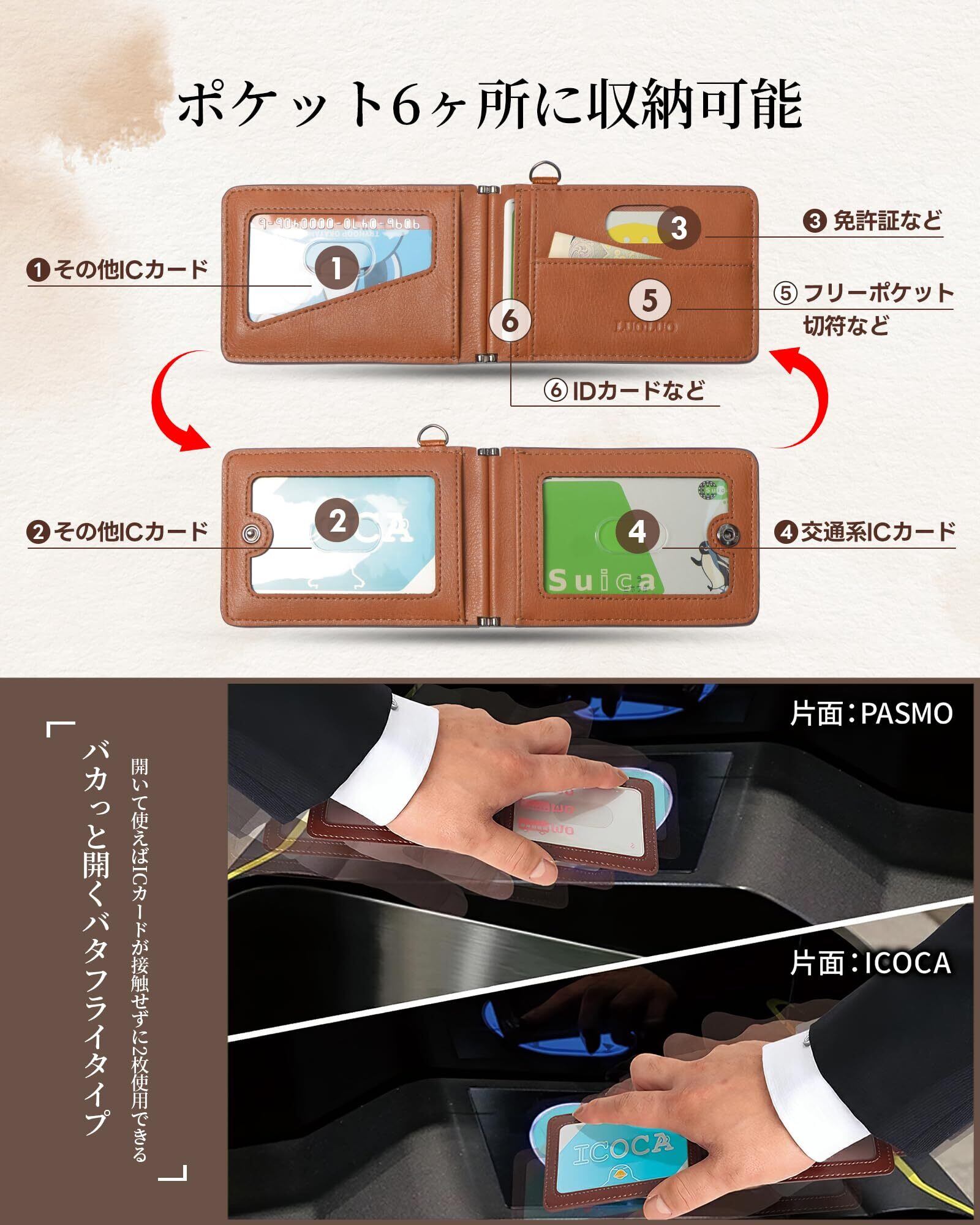 【ICカード2枚収納&エラー防止】パスケースの内側の左右に分けて窓付きポケットがあるので、2枚のICカードは収納可能とともに改札エラーを防止します。ほかの4つのポケットは交通系カード、常用のクレジットカード、免許証をまとめて使用できます。