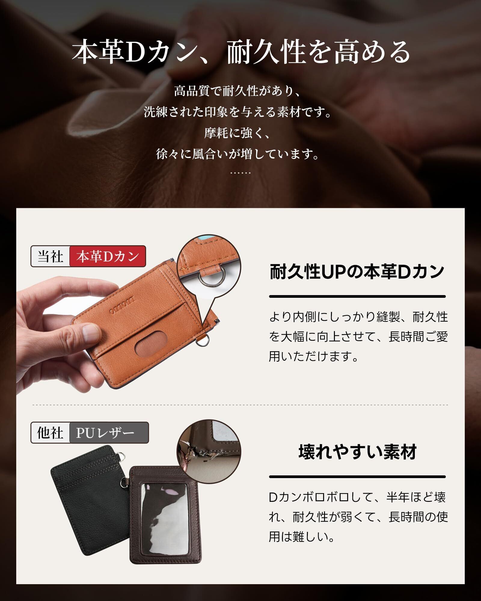 【耐久性アップの本革Dカン】この定期入れは従来品より、Dカンは本革素材を採用し、縫い目もより内側に縫製して、Dカンをしっかりと固定し、耐久性を大幅に向上させています。耐久性を両立させると同時に、環境にも配慮しています。定期入れ本体は動物愛護の観点から本革と似た合皮レザーを使用して見てくれも貧相ではない充分に立派です。