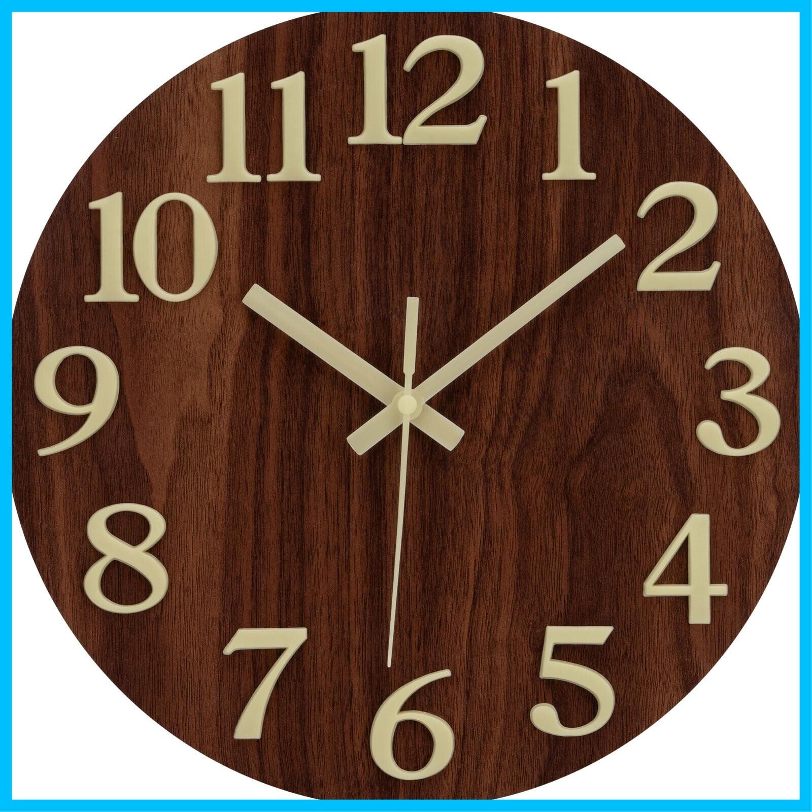 AUTVIVID 掛け時計 夜光 壁掛け時計 木製 静音 連続秒針 大文字 暗くなると自動で光る時計 夜でも見える 蓄光発光 3D大文字 読みやすい 直径30cm おしゃれ 自宅 寝室 インテリア (ウォールナット)