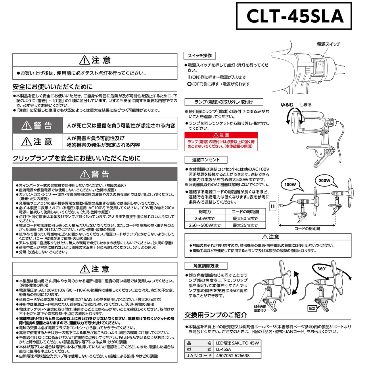 【付属ランプ(LL-45SA)】定格電圧:AC100V、定格周波数:50/60Hz、定格消費電力:45W、全光束:約5,000lm、光色:昼光色(約6,500k)