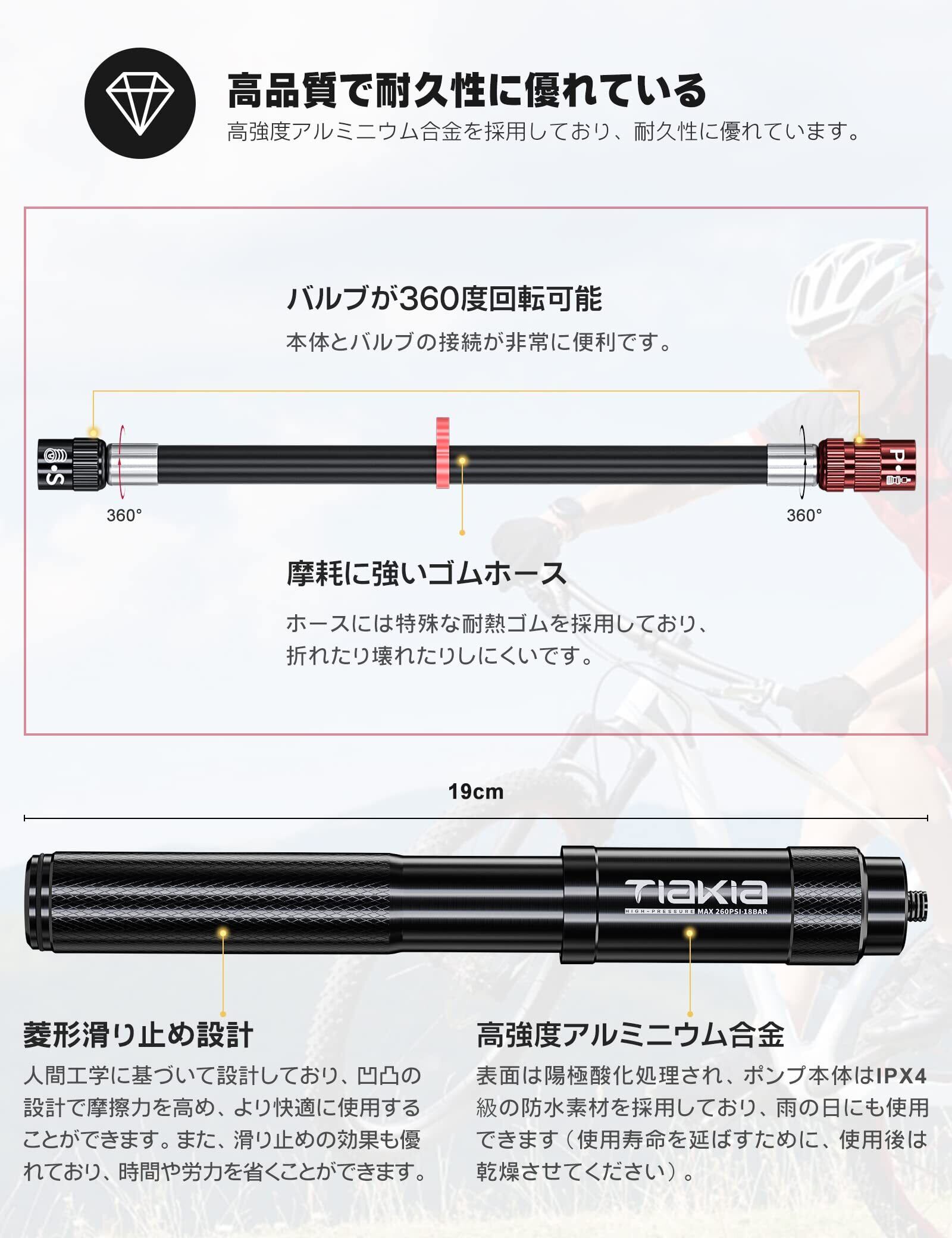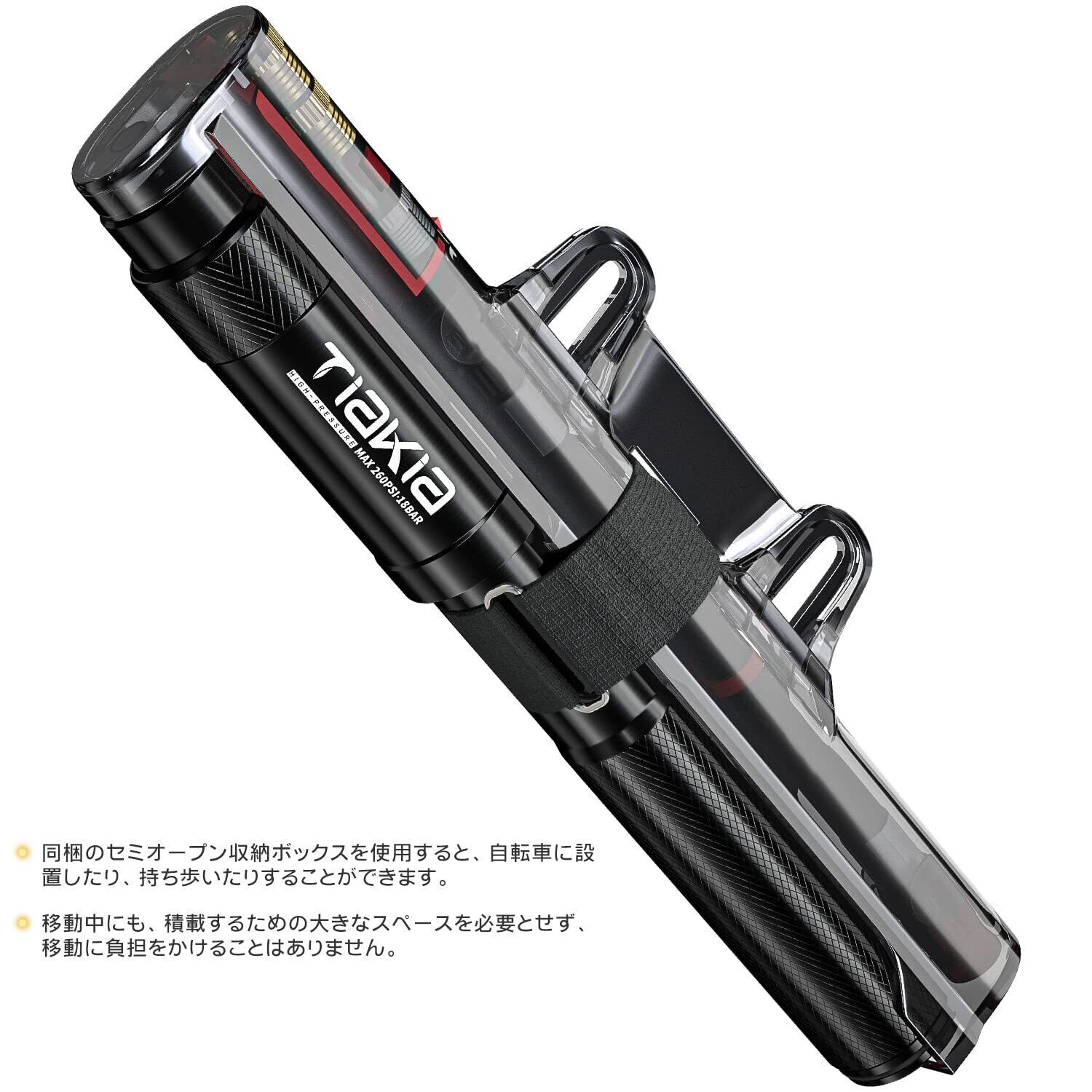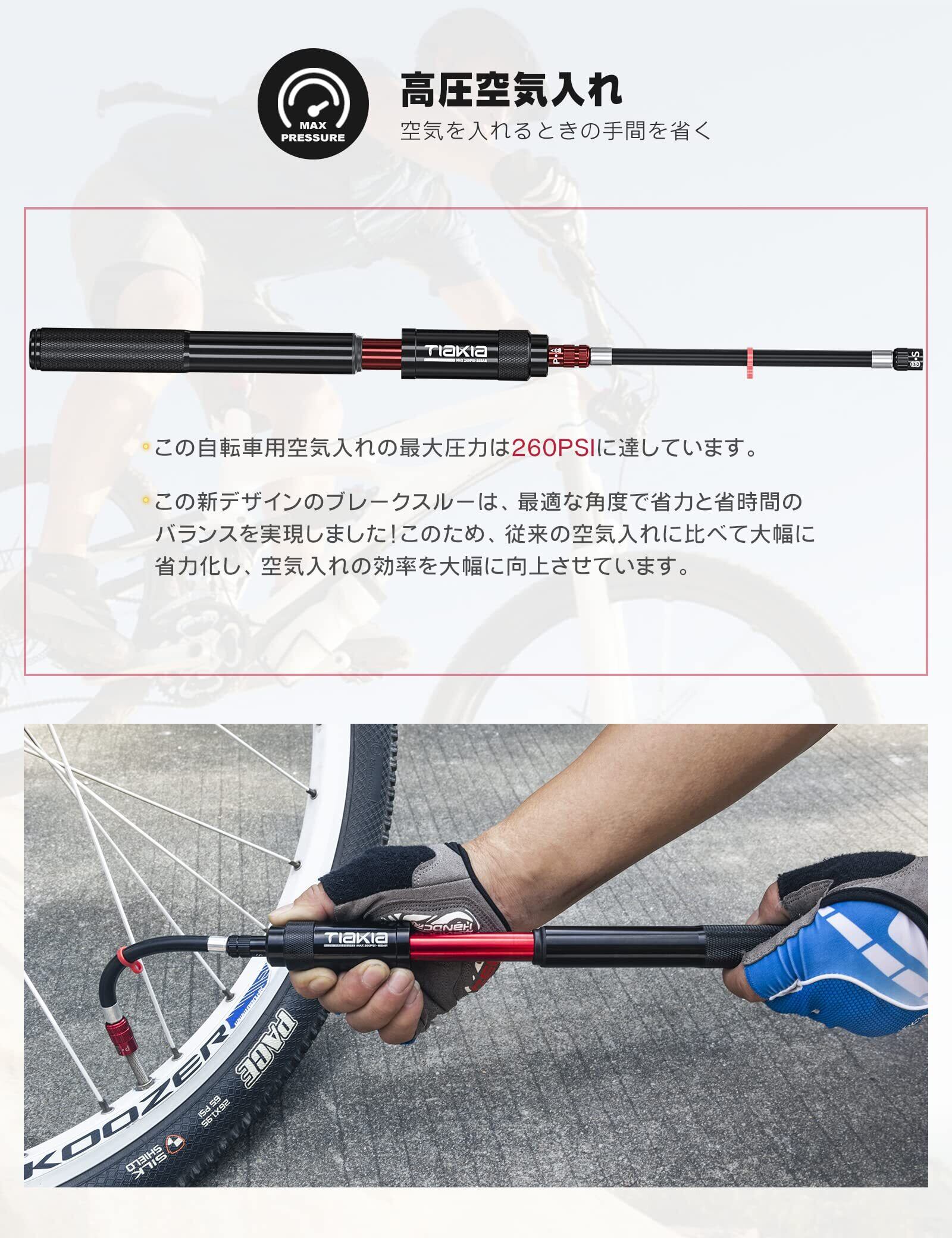 Tiakia 自転車 空気入れ くうきいれ 携帯用 フロアポンプ ポータブル 仏/英/米式 バルブ対応 高圧 260PSI アルミ合金製 耐久性高 コンパクトぽんぷ 軽量 ハンド 小型 収納便利 クロスバイク ボール/浮き輪/風船など適用