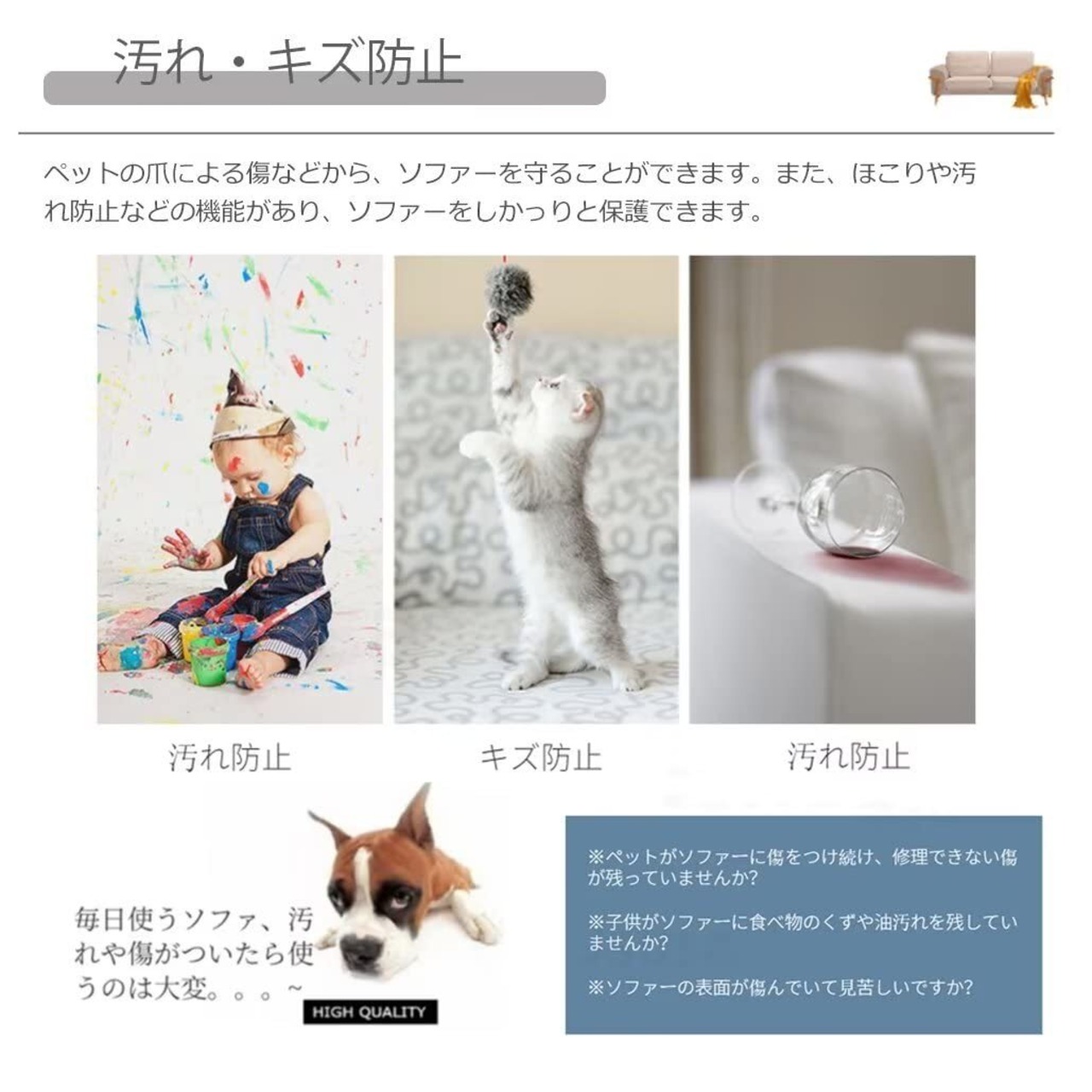 【両面使用・保護カバー】防塵、汚れ防止。ある程度では爪とぎ防止できる。ペットの爪による傷などから、ソファーを守ることができます。また、ほこりや汚れ防止などの機能があり、ソファーをしかっりと保護できます。赤ちゃん、子供、犬や猫のいるご家庭にお勧めです。