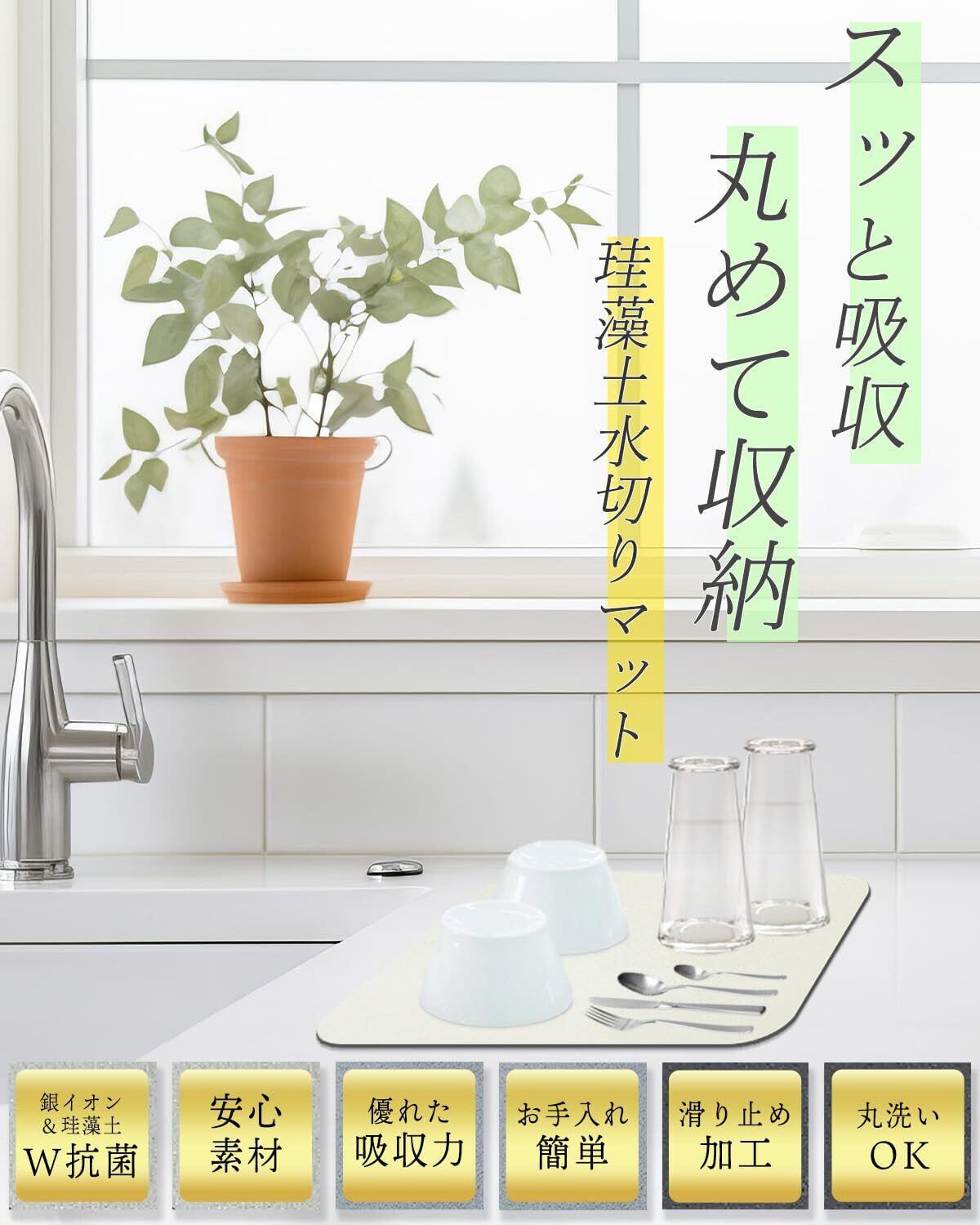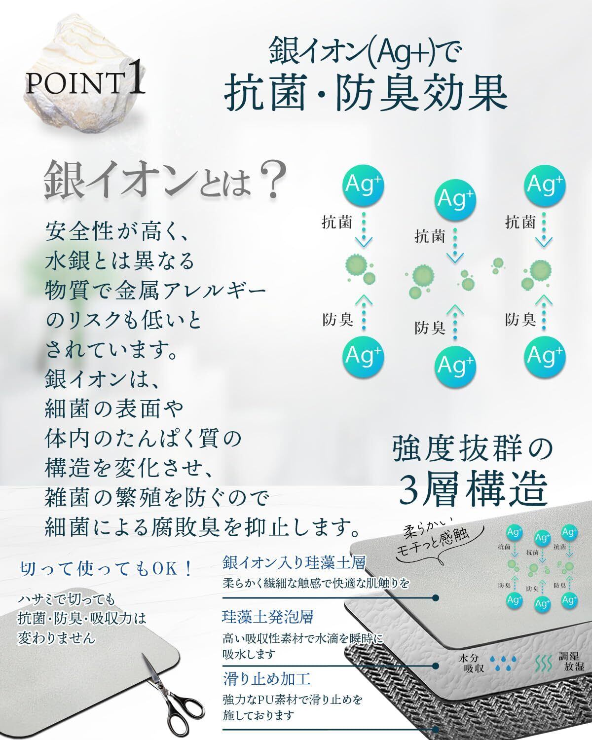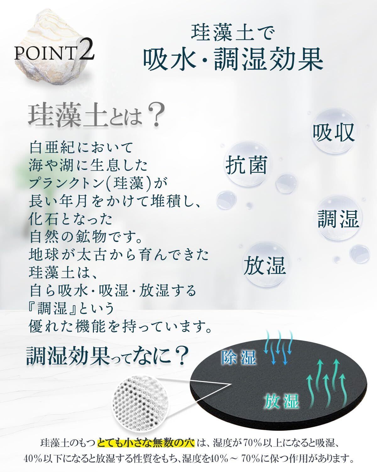 【珪藻土配合】吸水・吸湿・放湿する『調湿』という優れた機能を持っています。 珪藻土は、植物性プランクトンの化石を原料としており、無数の小さな穴があります。 これによって、高い吸水性と速乾性を兼ね備えています。