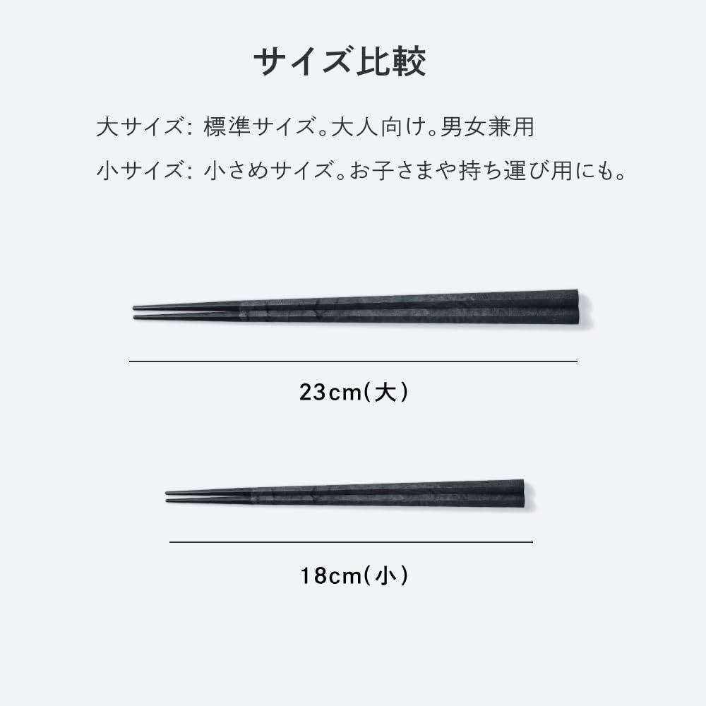 長さは23cmで、男性用・女性用でも使いやすい長さです。また、こども用の箸も18cmでご用意しています。洋食や中華料理などにも対応するデザインで、かわいい北欧食器や高級な陶器と組み合わせることで、大人と子供共に上質でおしゃれな食卓を演出することができます。