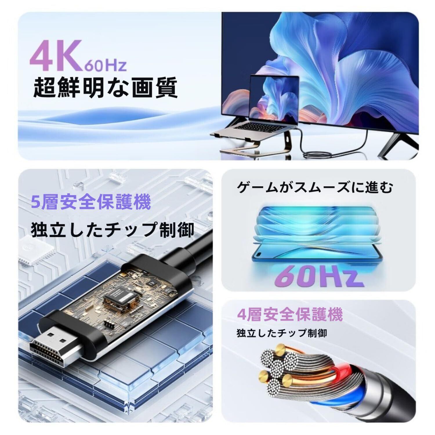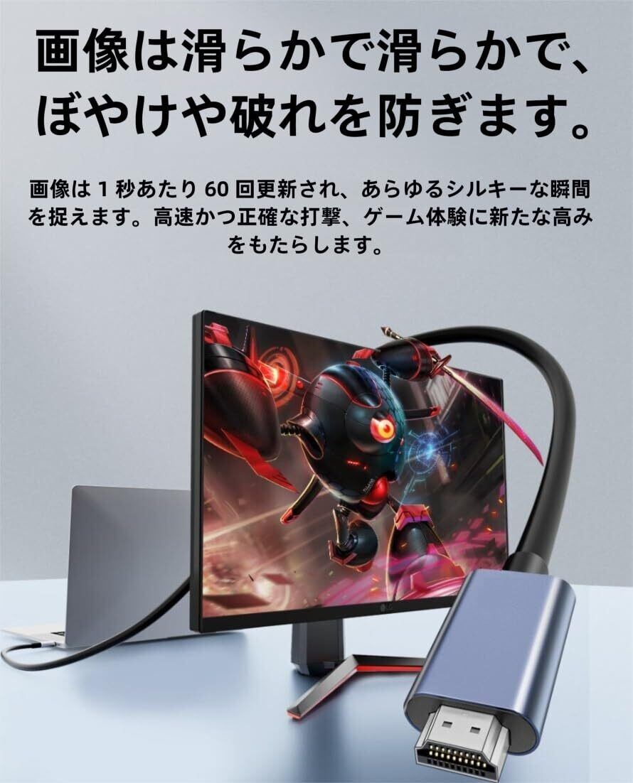 【4K@60Hz・HDR高画質対応・音声同期】 4K(3840×2160)@60Hz超高解像度出力に対応し、HDR(ハイダイナミックレンジ)による鮮やかな色彩表現が可能です。映像と音声を完全同期再生し、映画、ゲーム、リモート会議などに最適なリアルな映像体験を提供します。