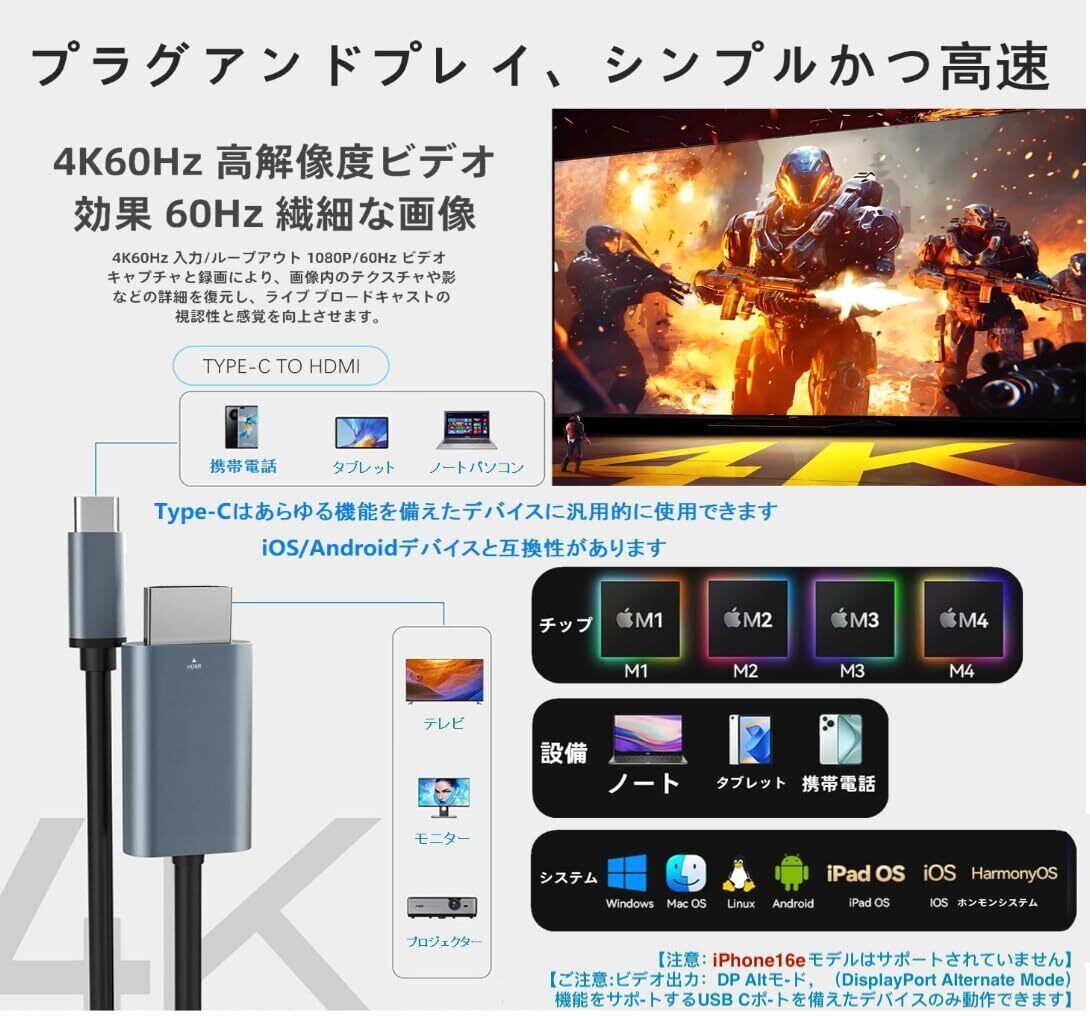 HDMI Type-C to HDMI ケーブル 1.8m【4K@60Hz HDR対応 音声同期】USB CタイプC HDMI変換ケーブル スマホとテレビをつなぐケーブル iPhone 17 Pro Max 17 Pro 17/16/15/MacBook/iPad/スマホType c 3.1接口/ノートPC対応 ゲーム/会議/プレゼン用 高耐久 プラグアンドプレイ