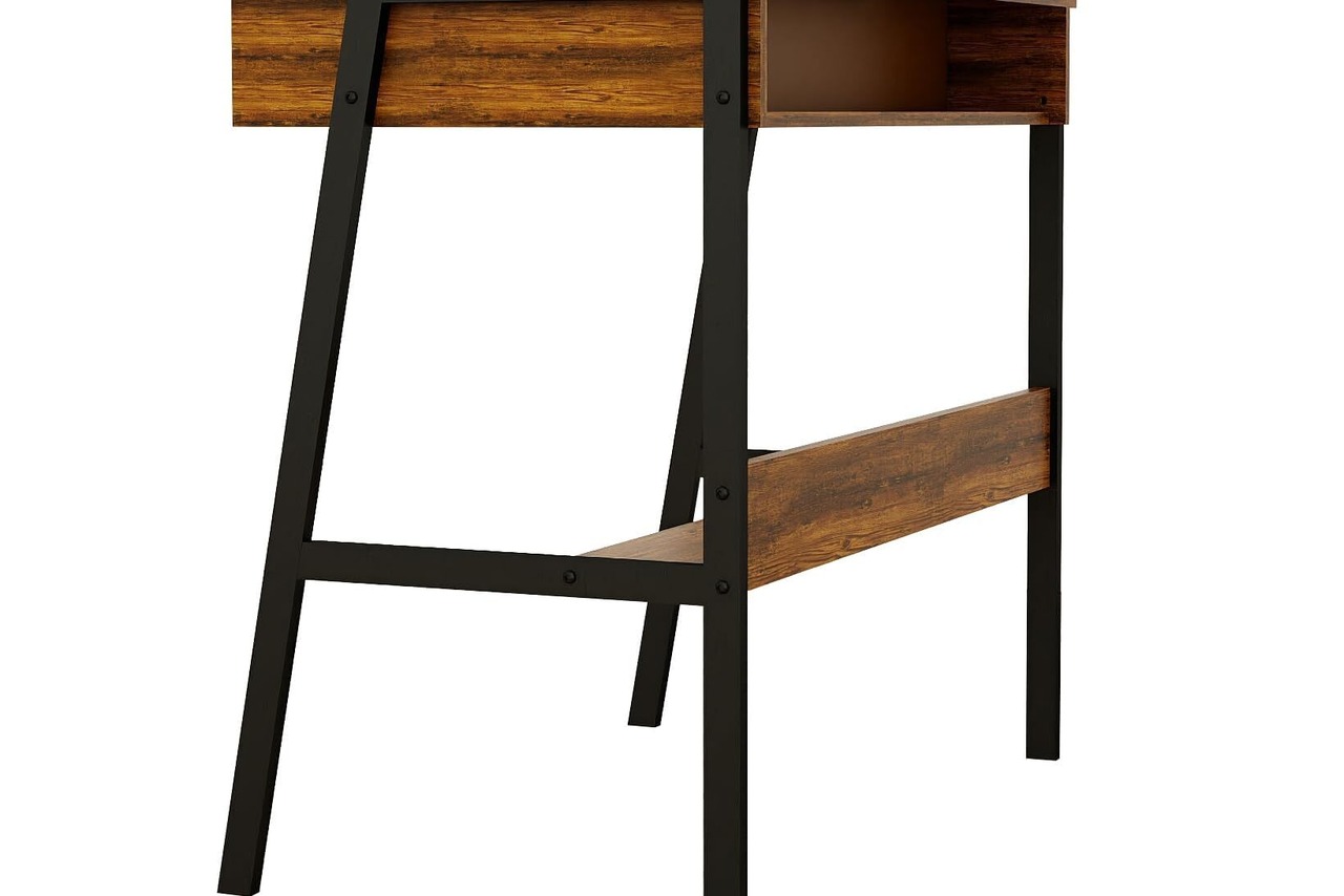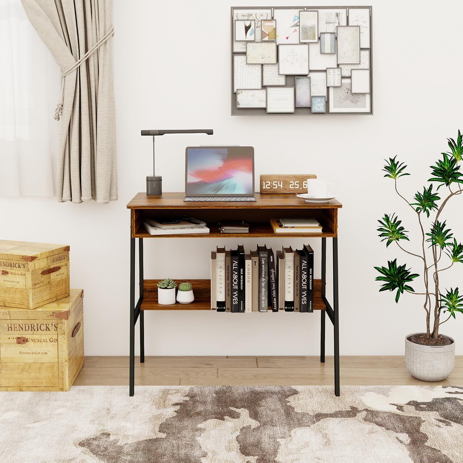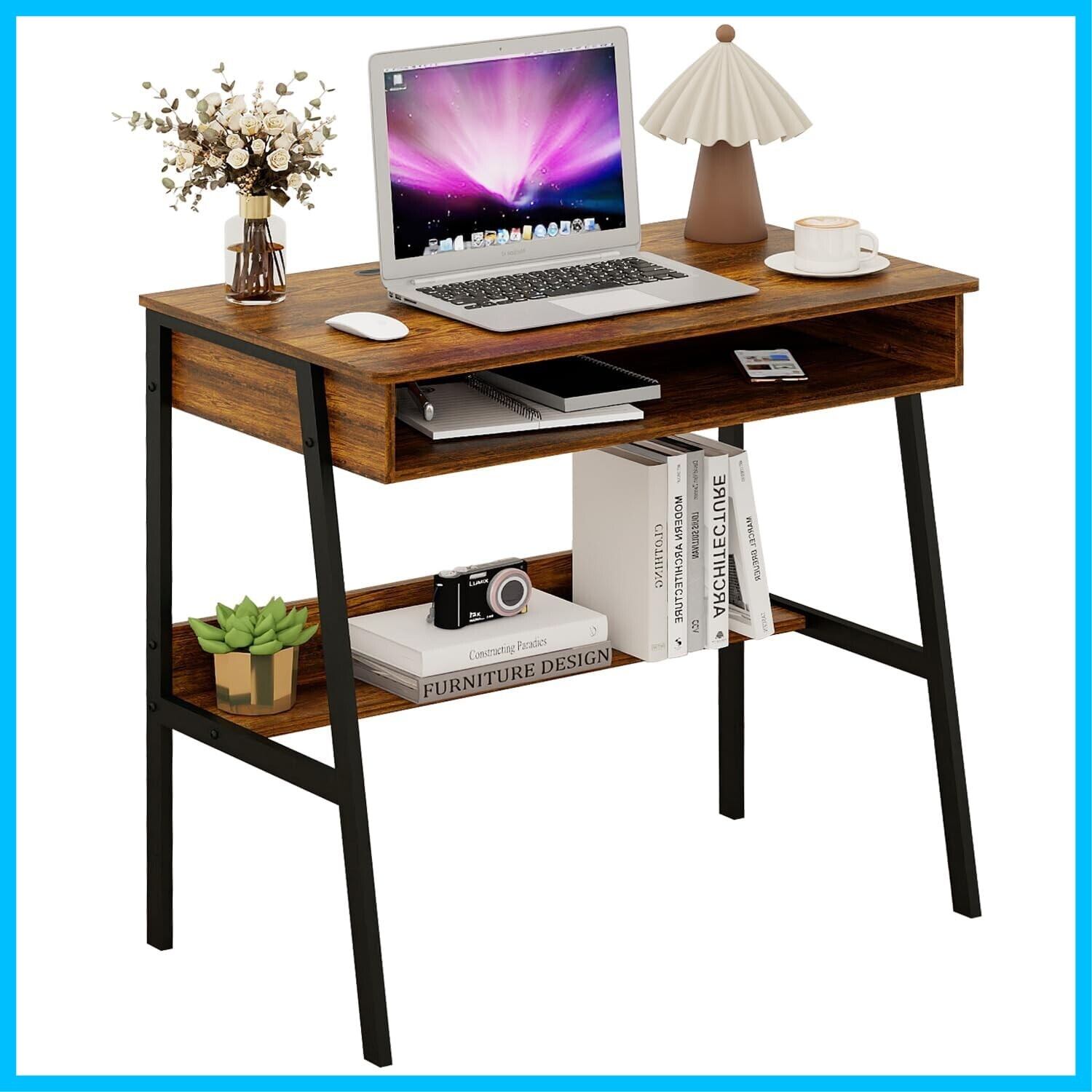 【素朴なブラウンのコンピューターデスク】このホワイト学習デスクは、小さな収納スペースのライティングテーブルとして設計されており、シンプルなデスクよりも多くの可能性を提供します。 頑丈な金属フレームにより、優れた安定性を確保。