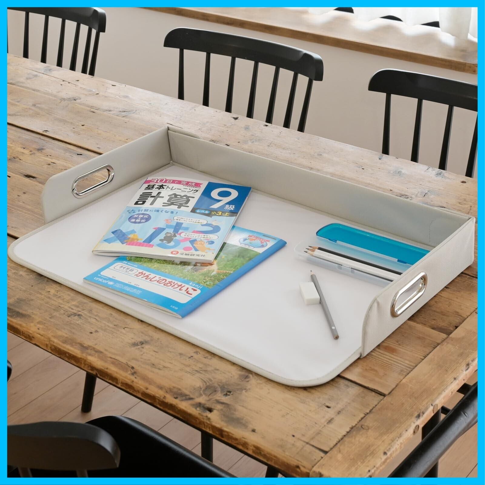 【持ち運びできるデスクマット】持ち手がついていて持ち運びがしやすく、片付けにぴったりなデスクマットです。文房具やプリントをひとまとめにして運べるので、お子さんのリビング学習にもオススメです。