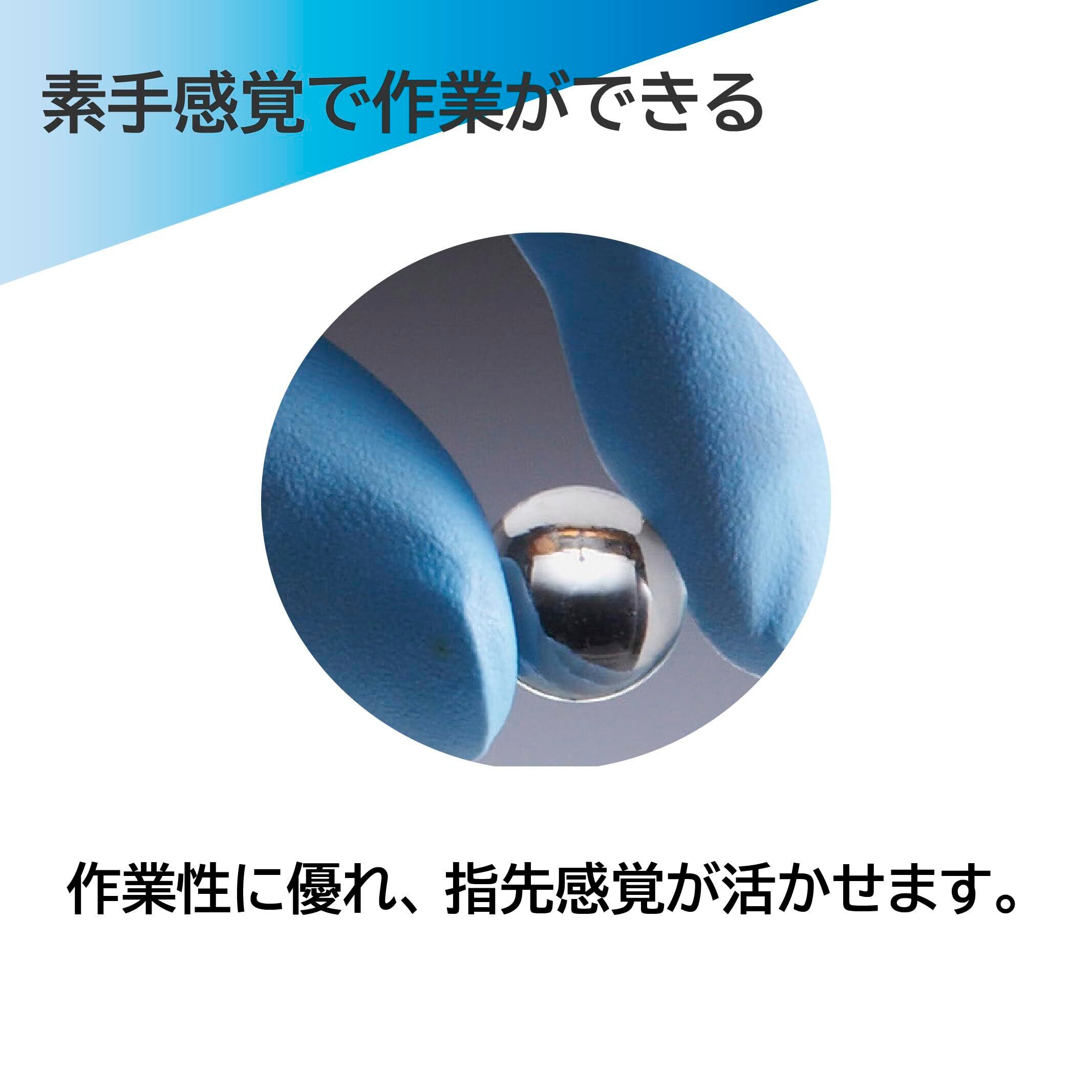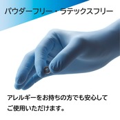 【均一な厚みで破れにくい】伸縮性のあるニトリルゴム製使い捨て手袋で、厚み約0.08mmのレギュラータイプ、手袋内面はパウダーフリー(粉なし)です。