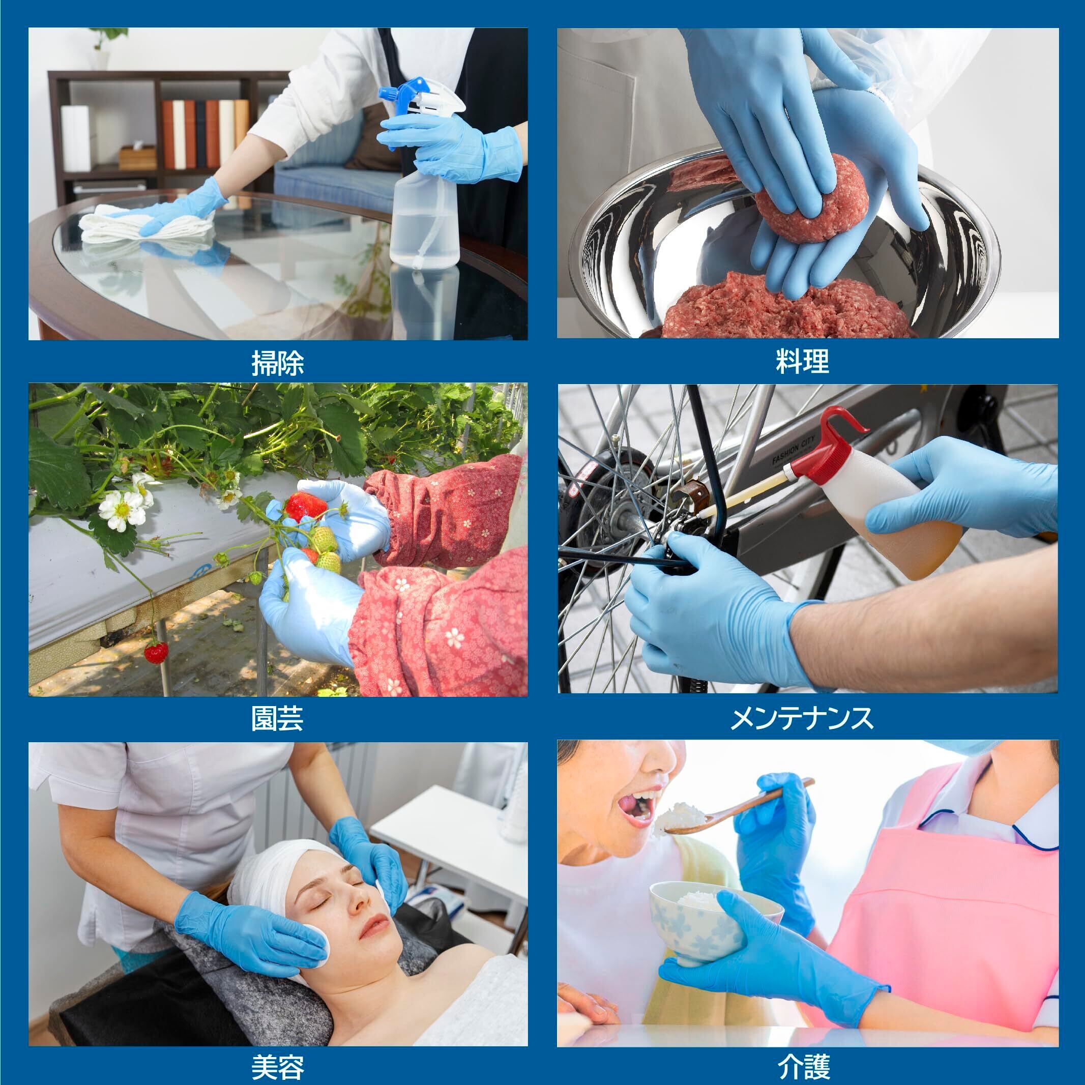 【食品衛生法適合】調理や料理など直接食品に触れる作業にもお使いいただけます。ご家庭でのお掃除や草むしりなどちょっとした作業や、ニトリルゴムは耐油性にも優れるため自転車などのメンテナンスなど様々なシーンでお使いいただけます。
