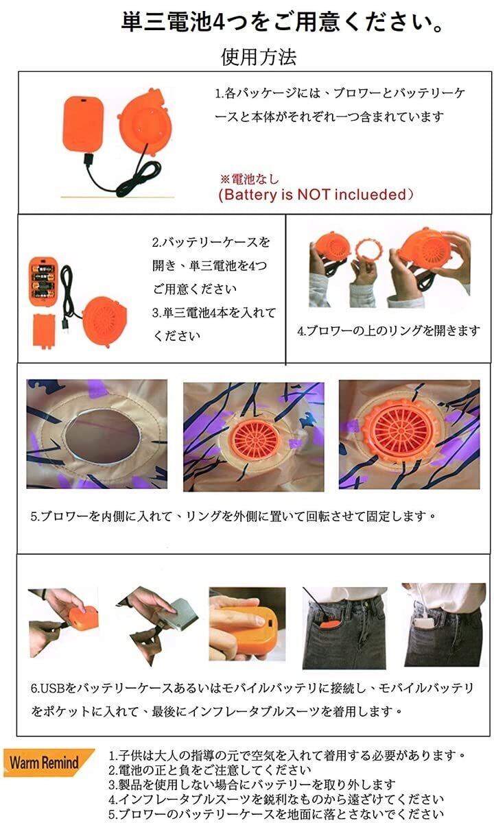 ✿単三電池4本が必要です。(商品に含まれておりません。)電池によってファンが回転し、数秒でコスチュームは膨らみます。