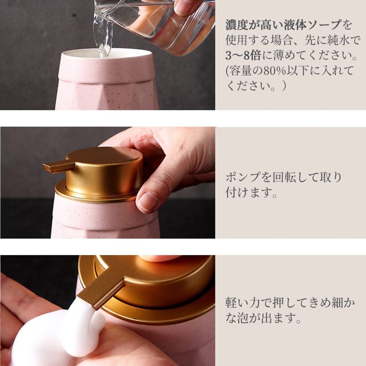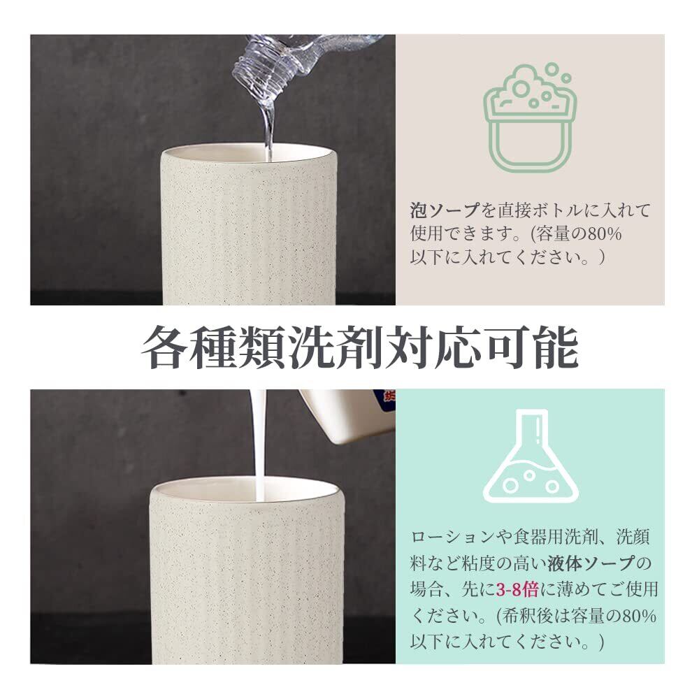 【各種類洗剤対応】市販の一般洗剤を対応できます。泡ソープは直接ボトルに入れて使用できます。ローションや食器用洗剤、洗顔料など粘度の高い液体ソープの場合、必ず先に純水で3-8倍に薄めてご使用ください。