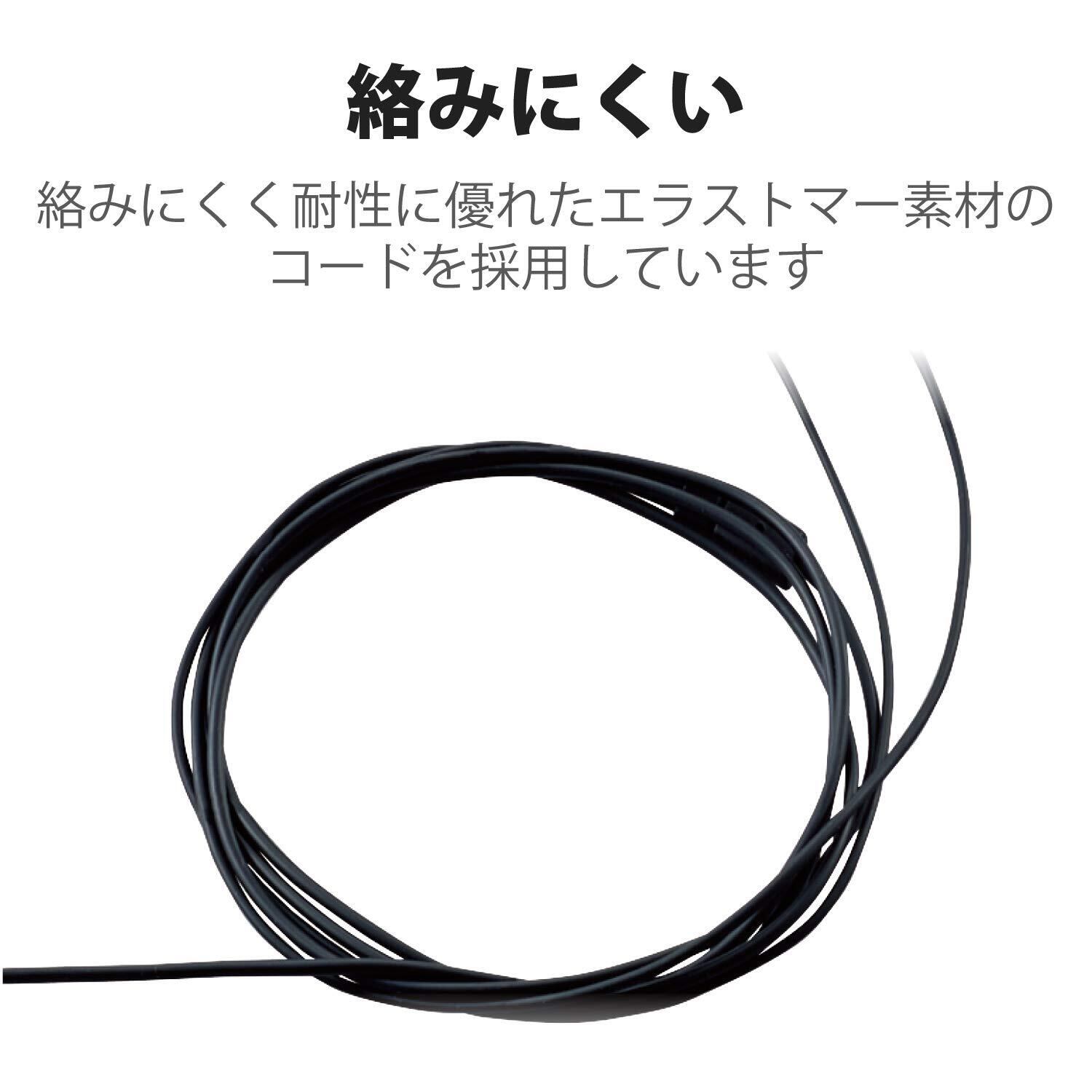 絡みにくく耐性に優れたエラストマー素材のコードを採用しています。また、芯線にナイロン線を入れることで強度を上げています。