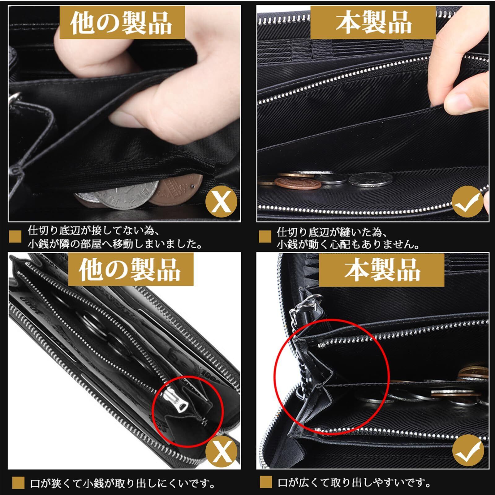 選ばれる理由:①蛇腹式カードケース採用するので、カードだけで23枚以上は入るがことできます。更に、全ての個所にカードを入れましたが、全然厚みが変わらないです。②ラウンドファスナー使用するので、開くと一目瞭然で、カードやお札も取り出しやすく、とても使いやすいです。③通常の約1.5倍のコストがかかるYKKファスナーを採用して、耐久性抜群·開閉のスムーズさともに段違いに性能アップ!④小銭入れの仕切り底辺が縫いた為、小銭が動く心配もありません