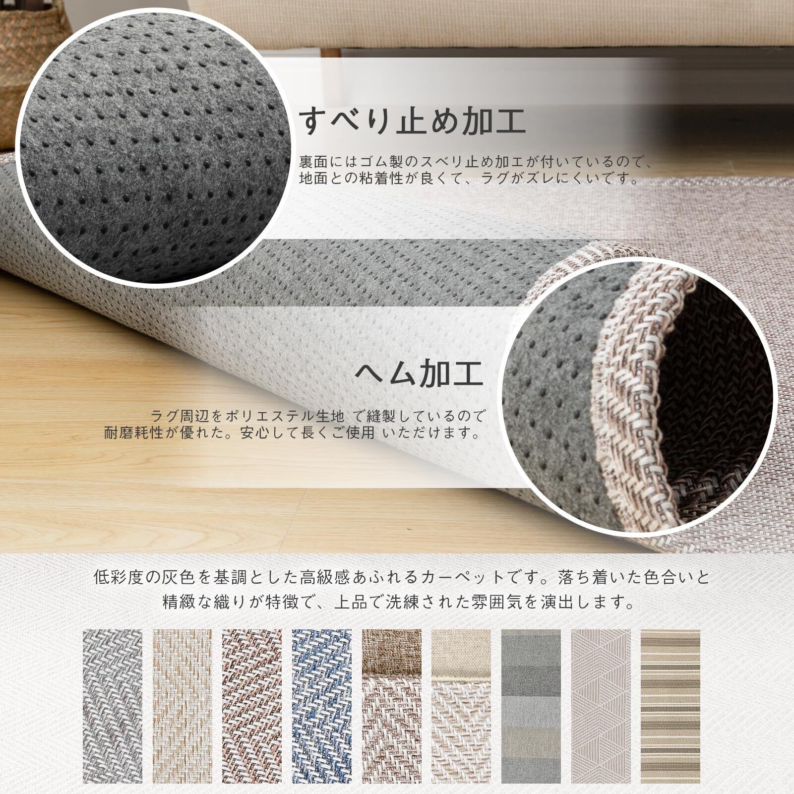 【オールシーズン快適】カーペットの取材は服と同じ繊維を使っているため、適度な厚みで空気をたっぷり含んで断熱します。生地がサラッとした感触なので、夏でも裸足で気持ち良いです。裏面に耐熱加工を施しているので、床暖房のお部屋での使用やホットカーペットカバーとしてもOKです。