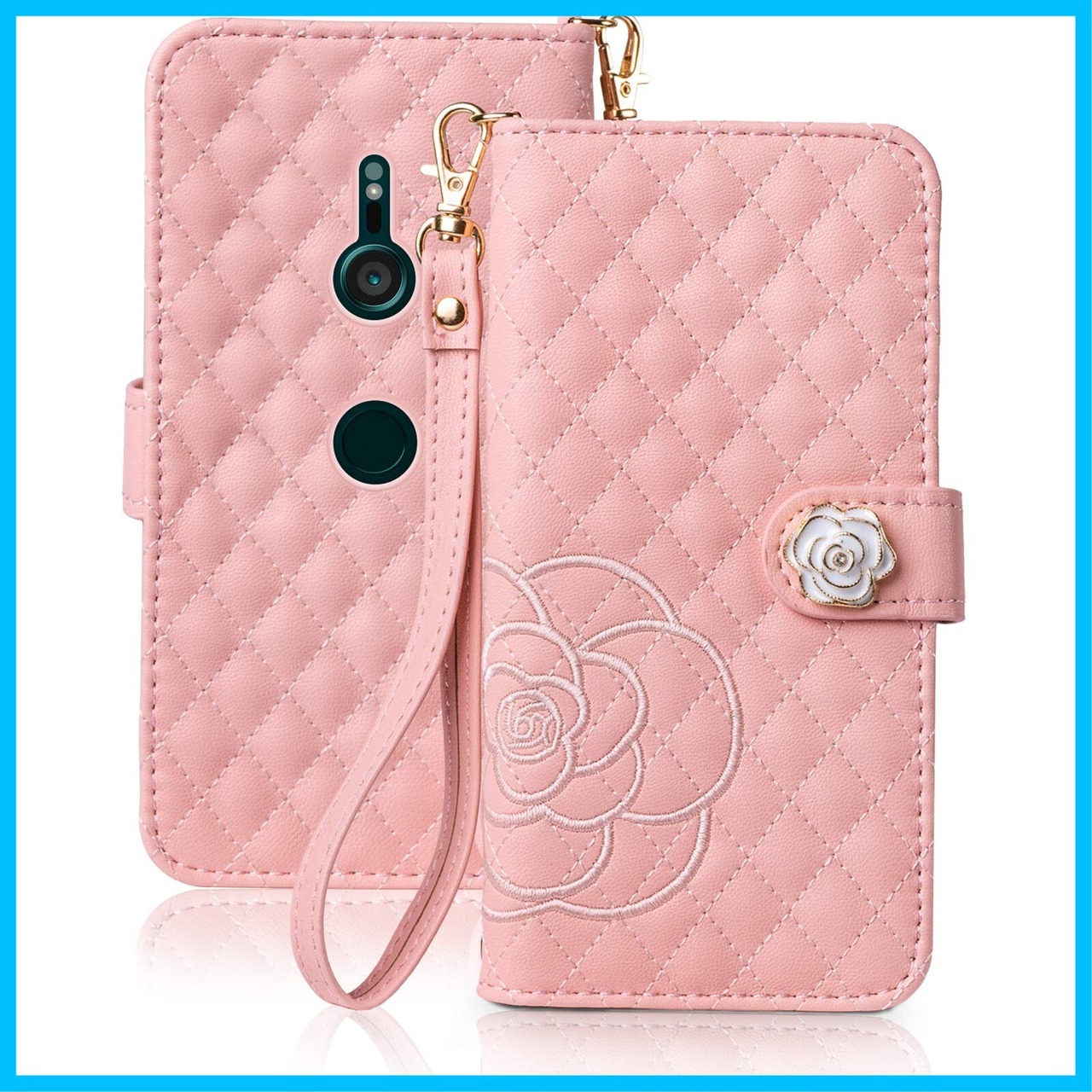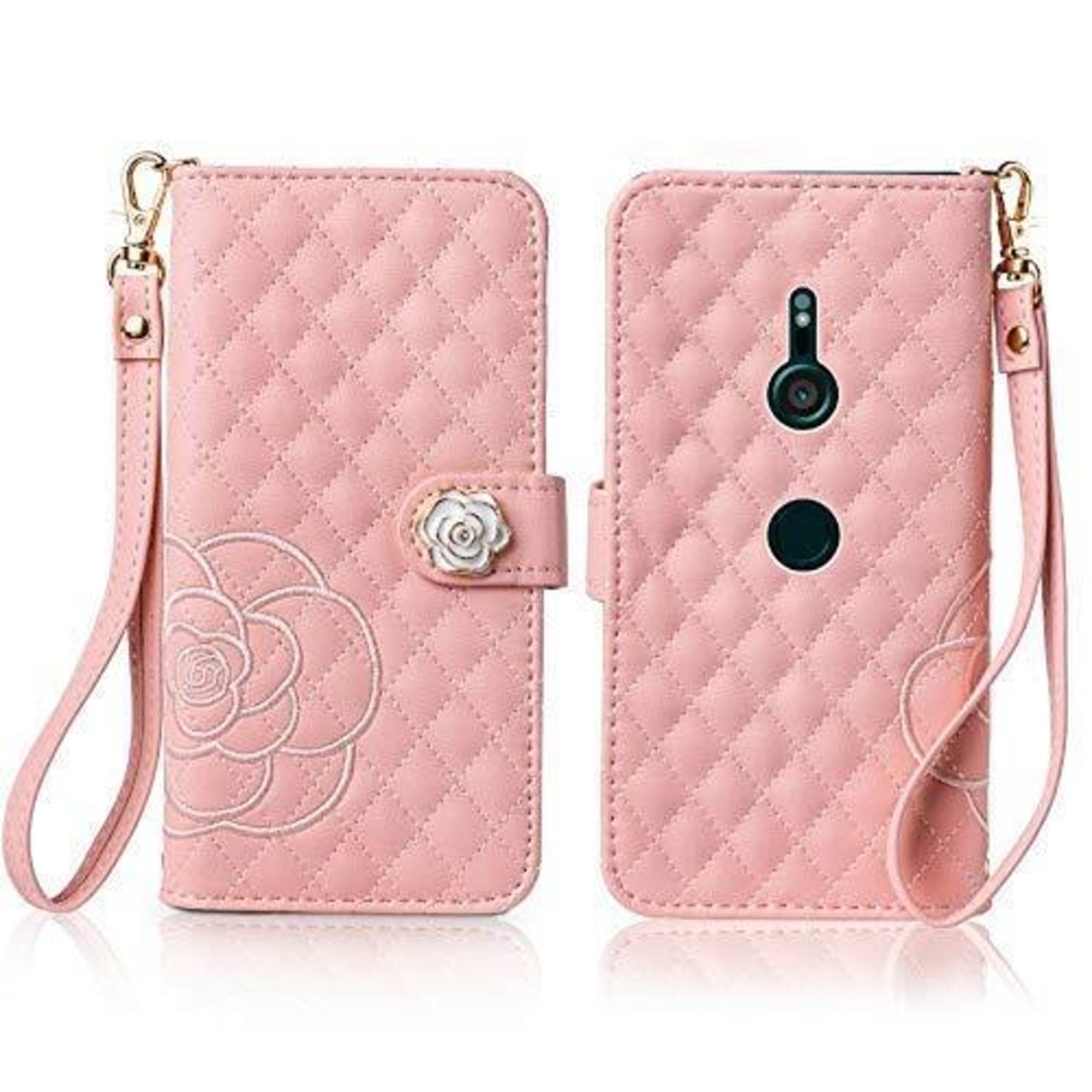 SZJAMIE Xperia XZ3 ケース 手帳型 SO-01L SOV39 801SO スマホケース 薔薇と山茶花刺繍 エクスペリアXZ3 手帳型ケース 花柄 おしゃれ 可愛い 女性向け 手触り柔らかい 耐衝撃 スタンド カード収納 財布型 全面保護 ストラップホール&ハンドストラップ付き プレゼントに最適 (Xperia XZ3 (SO-01L/SOV39/801SO)対応, ピンク)