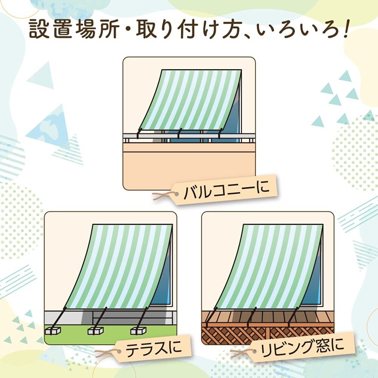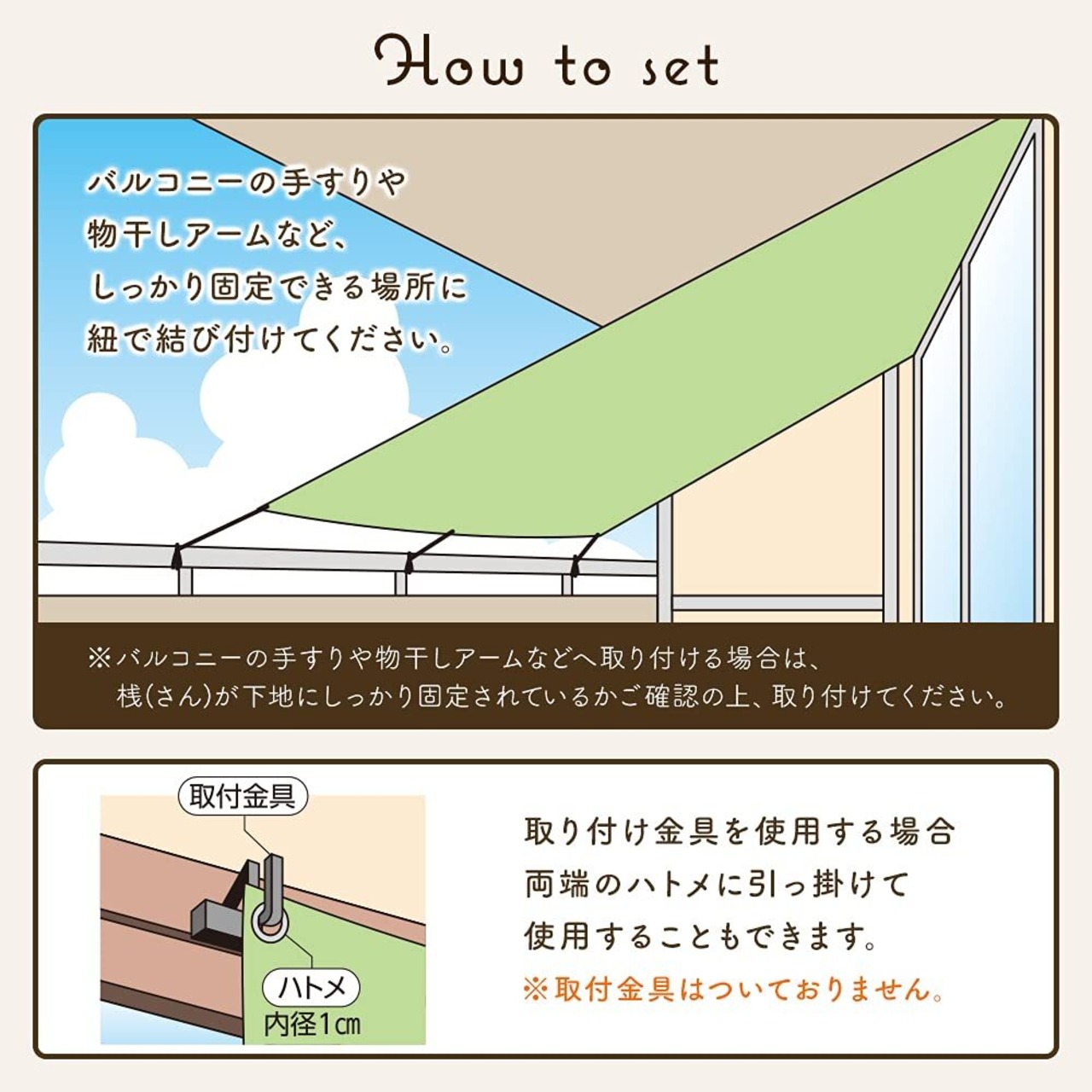 【使用方法】バルコニーの手すりや物干しアームなど、しっかり固定できる場所に紐で結び付けてください。※バルコニーの手すりや物干しアームなどへ取り付ける場合は、桟(さん)が下地にしっかり固定されているかご確認の上、取り付けてください。取り付け金具を使用する場合両端のハトメに引っ掛けて使用することもできます。※取付金具はついておりません。