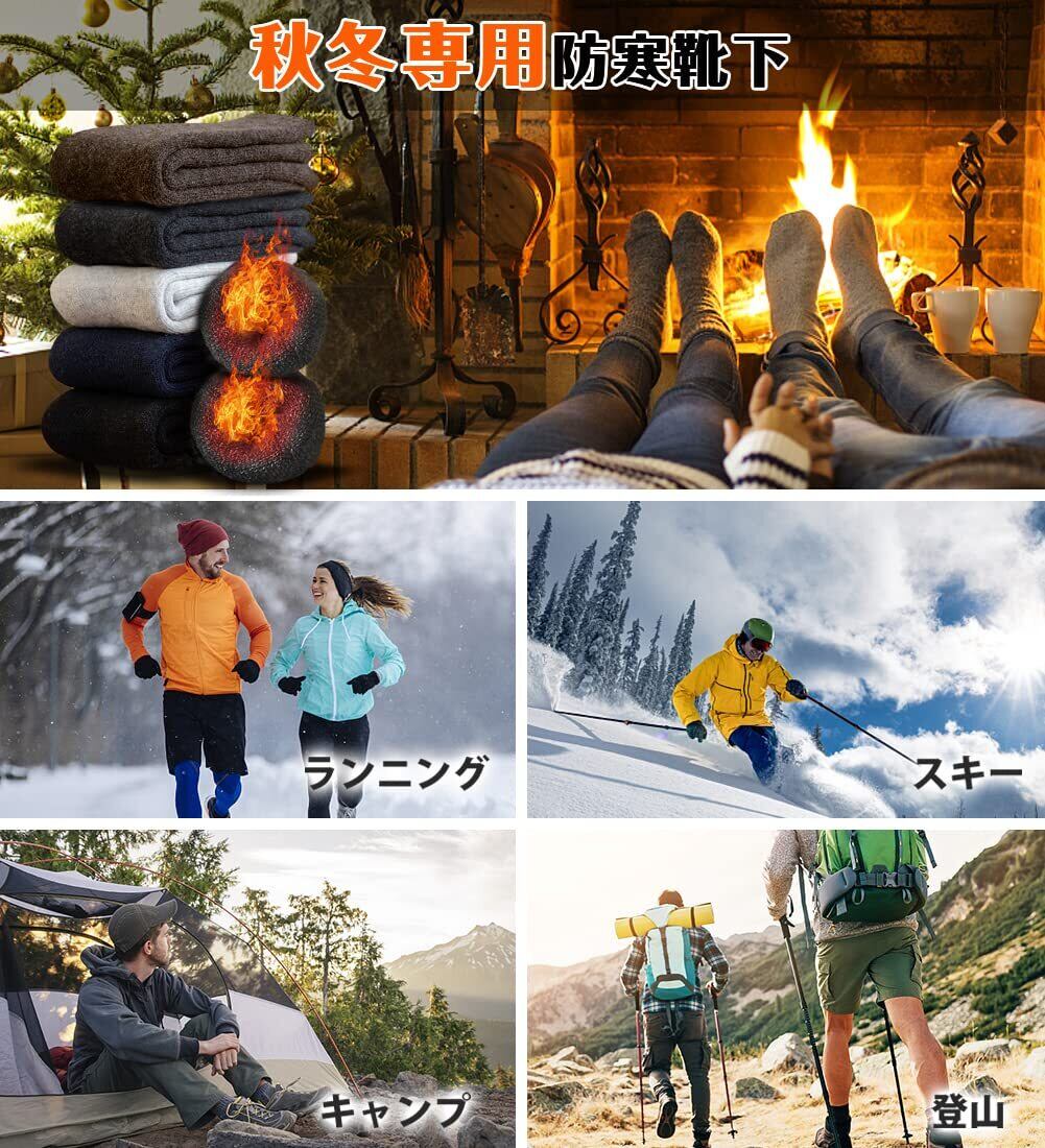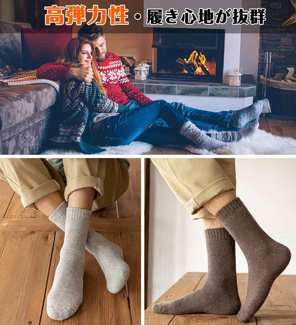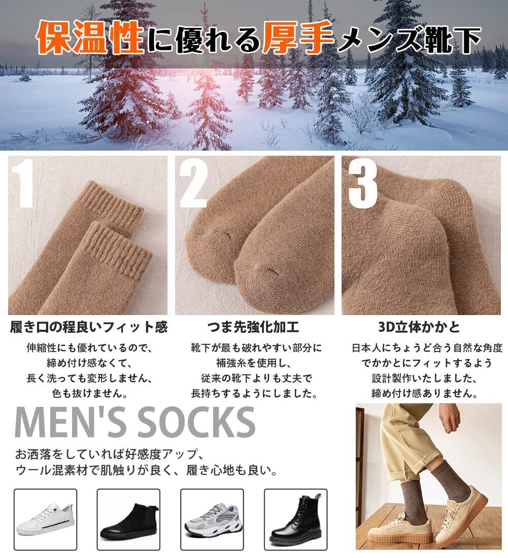 【抗寒力max裏起毛・極暖38℃恒温】靴下は丈夫な材料と丁寧な編み方で足全体フィットし、足にピッタリ、ズレにくいです。上質なウール質を採用して、裏地は極厚手起毛、保温性は普通の靴下の5倍、厳冬にアウトドアしても保温性が良い 靴下 メンズ 厚手。履き口からつま先まで全部ふわふわとして、まるで毛布に包まれているような、滑らかな肌触りで足全体をやさしく包み込んでくれるから、同時に厚地裏起毛のデザインを採用し、足の熱量をしっかりとロックさせて、不思議な38℃恒温を実現します。