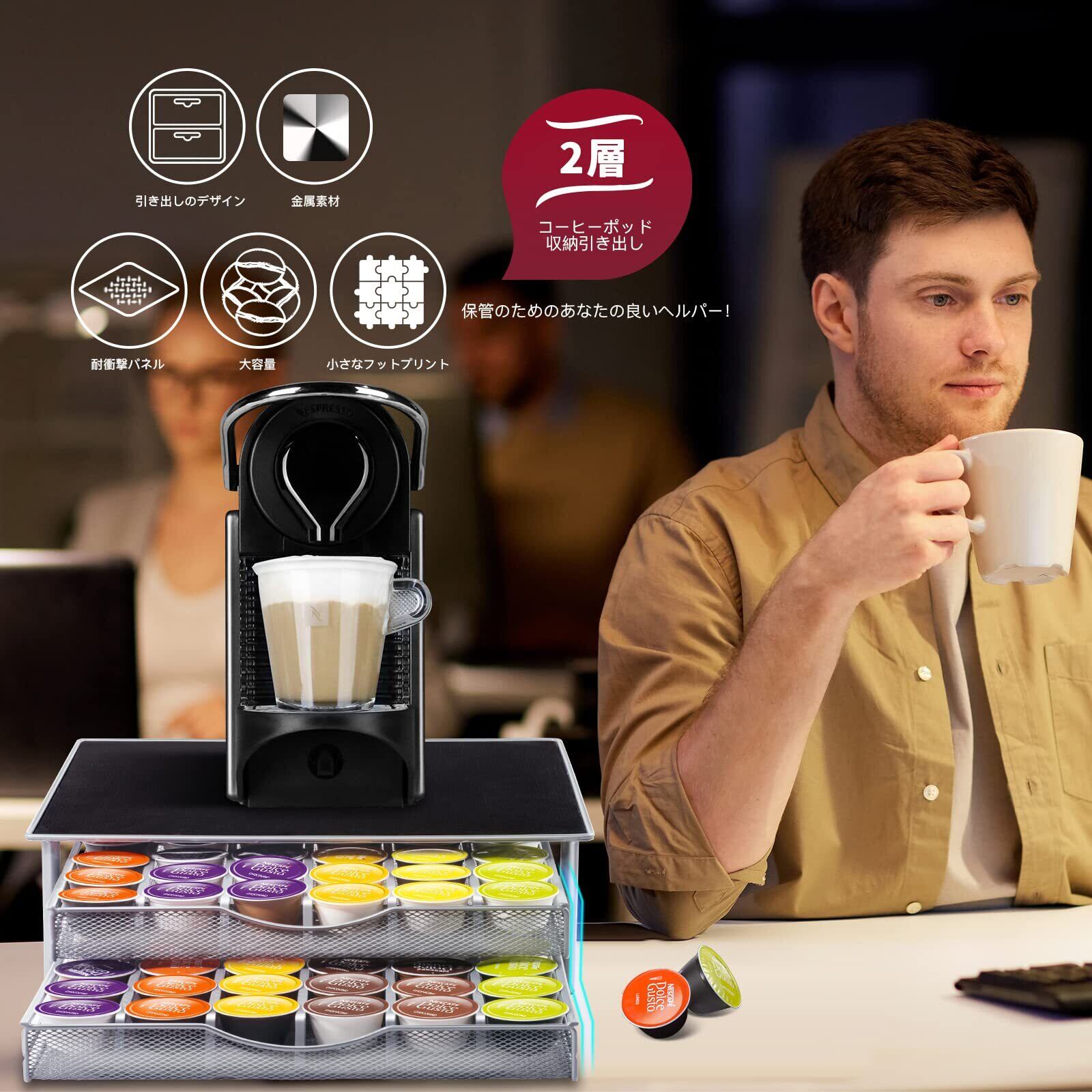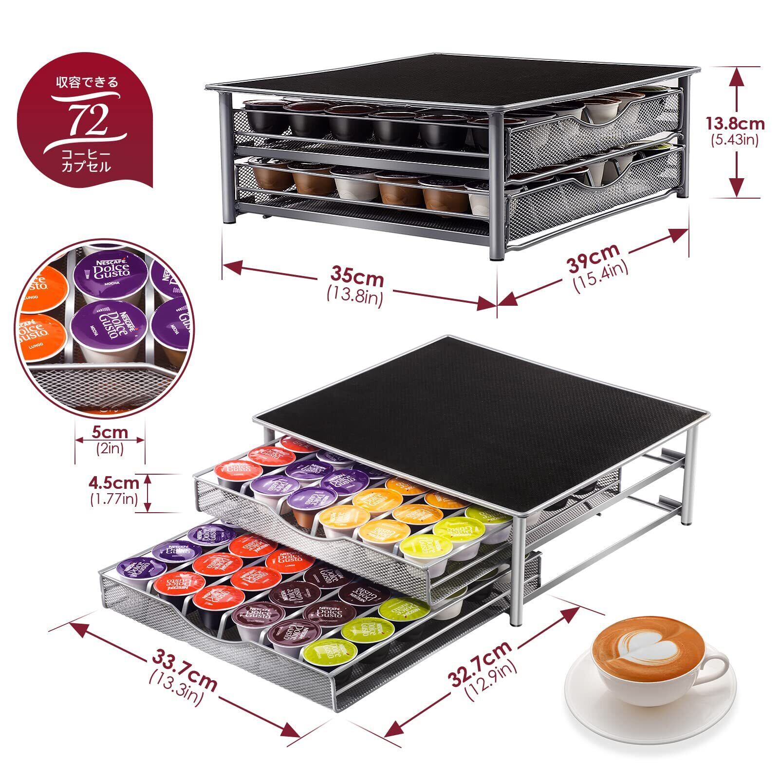【商品サイズ】カプセルホルダーのサイズは35*39*13.8cm、含まれているアイテム:1 *カプセル引き出しのみ。コーヒーカプセルは除外されます。コーヒーパック用引き出し : 最大72個のネスプレッソカプセル収納可。