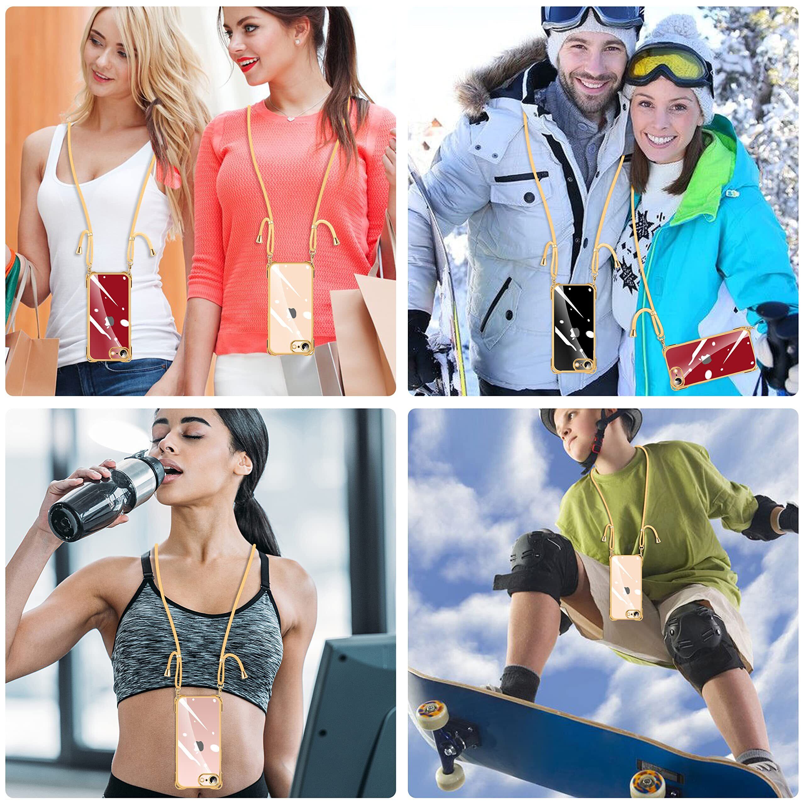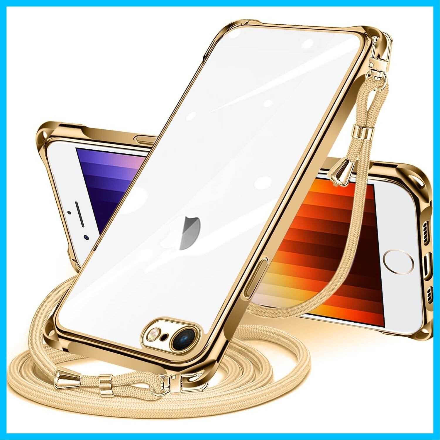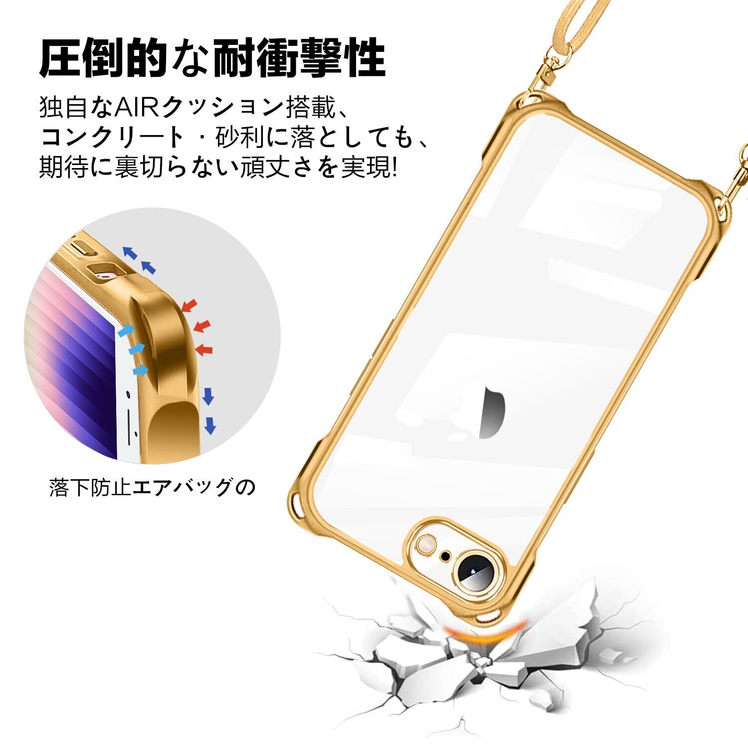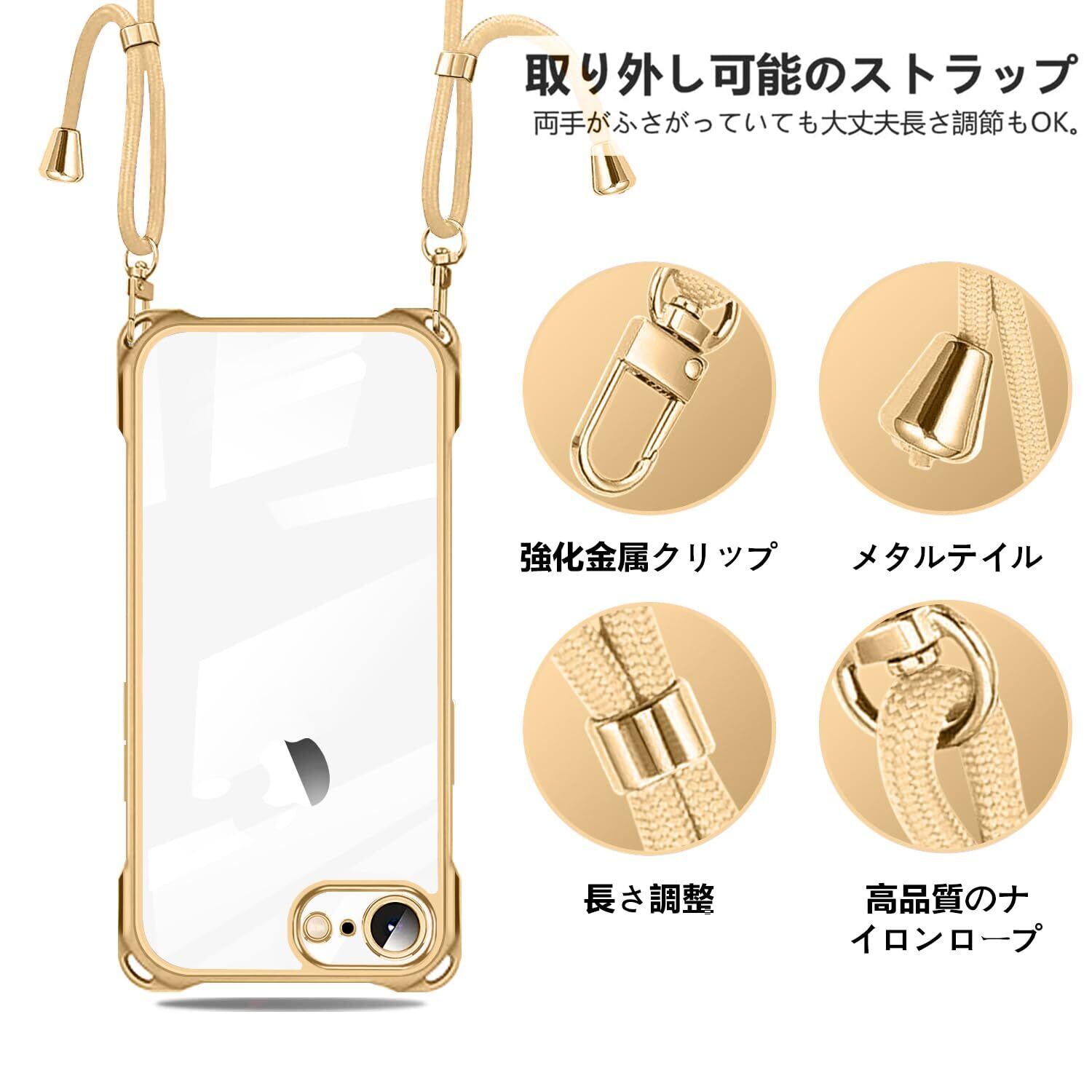 NISIILNG iPhone SE 第3/2世代 7 8 用 ケース クリア ショルダー iphonese 7 8 用 スマホケース アイフォン7 8 se2 se3 カバー 肩掛け 斜めかけ 縄掛けケース 透明 TPU 薄型 軽量 耐衝撃 紐付き 斜めがけ 織りストラップ付き ネックストラップ ショルダー 縦/横 2WAY 長さ調整可能 取り外し可能 落下防止 紛失防止 (ゴールド)