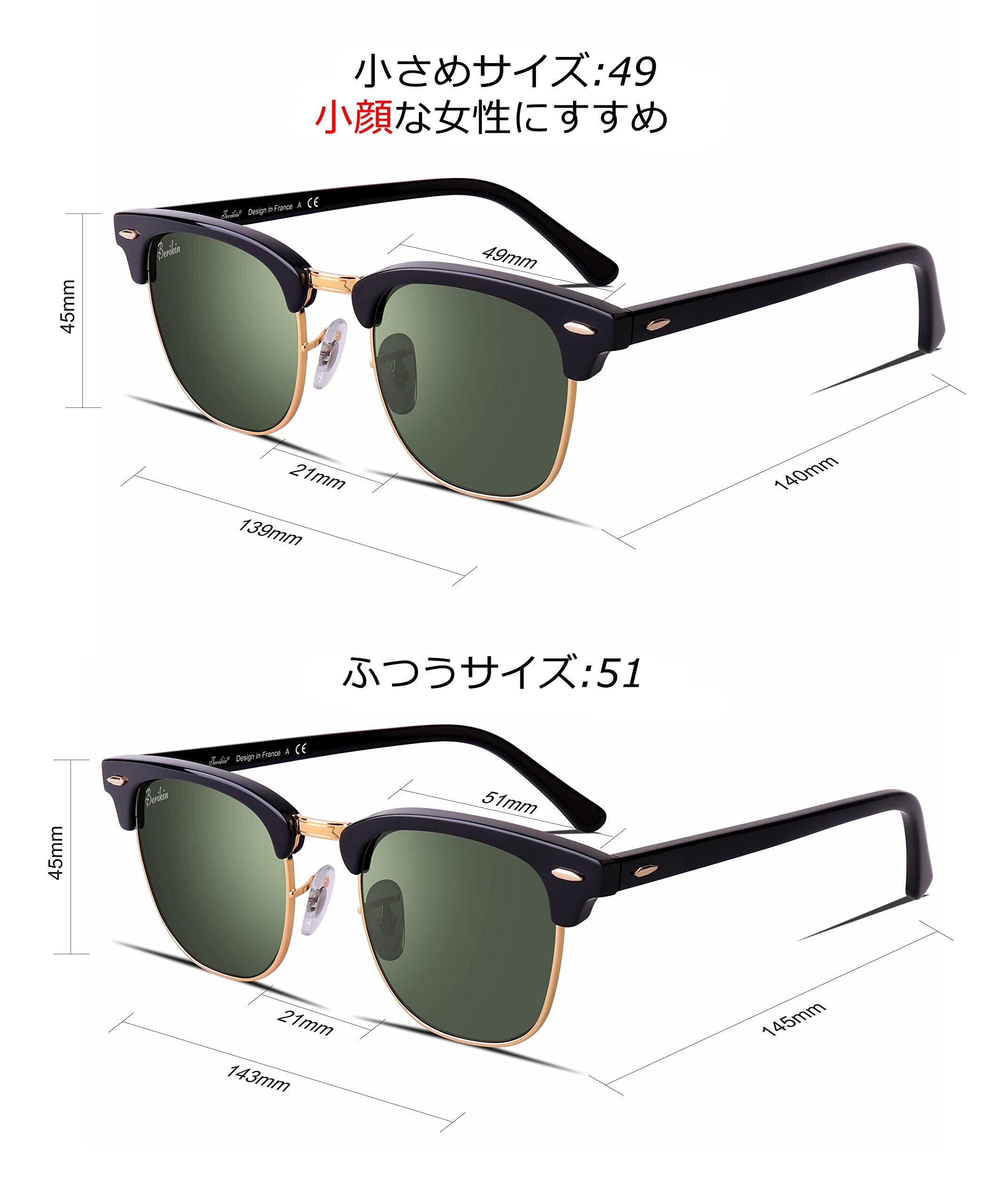 【サイズ】51サイズ 【A】レンズのよこ幅:51mm【B】レンズのたて幅:43mm【C】ブリッジ幅:21mm【D】全体のよこ幅:143mm【E】全体のたて幅:47mm【F】テンプルの長さ:145mm