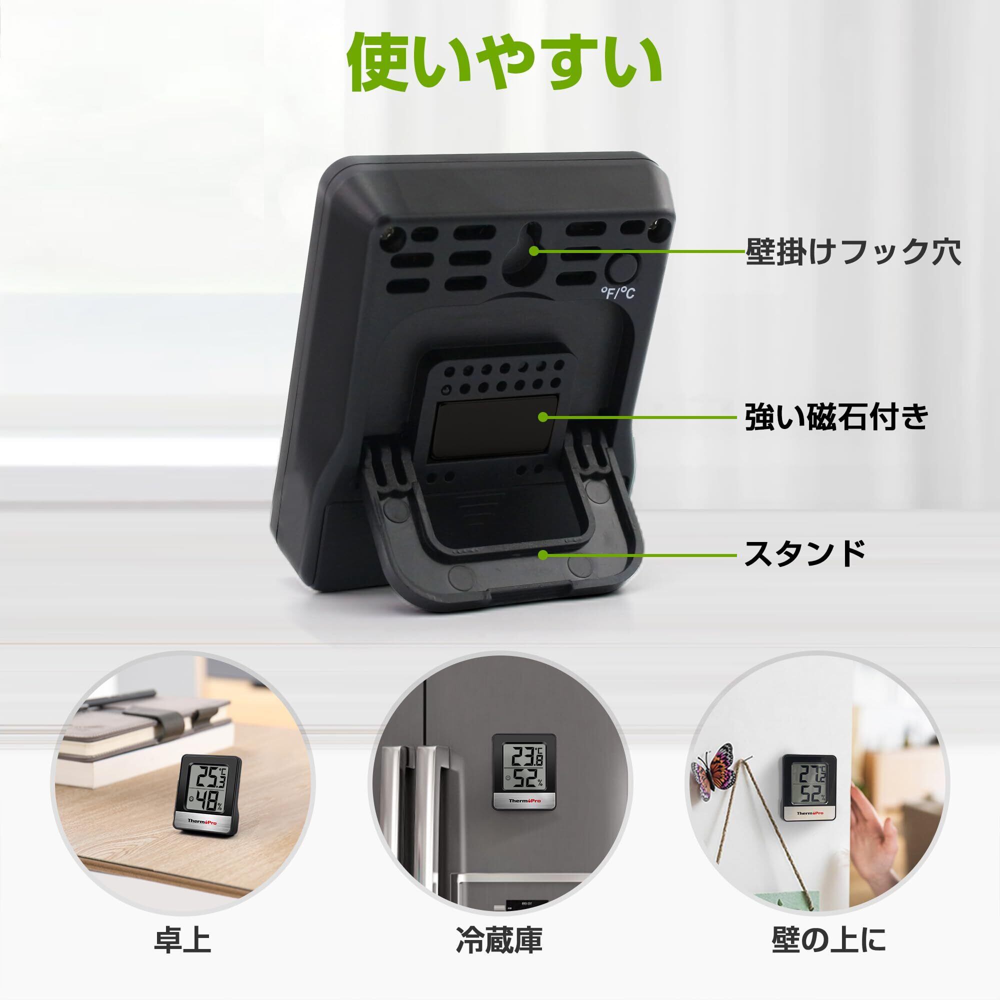【3wayで自由に設置】室温計はキッチンや寝室など室内のあらゆる場所で使いやすいように磁石(強力マグネット)、壁掛け、スタンドの3wayで設置できます。マグネットで冷蔵庫につけたり、壁にかけたり、スタンドを開いて卓上で使ったり、生活のシーンに合わせて活用できます。