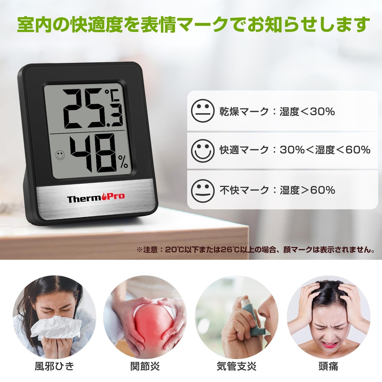 【快適度が一目でわかる】温度と湿度の関係から快適さを顔マークで表示します。状況に合わせて表情が三段階で変化し、室内の温湿度の快適さの目安になります。(注意:気温が20℃以下または26℃以上の場合、顔マークは表示されません。)