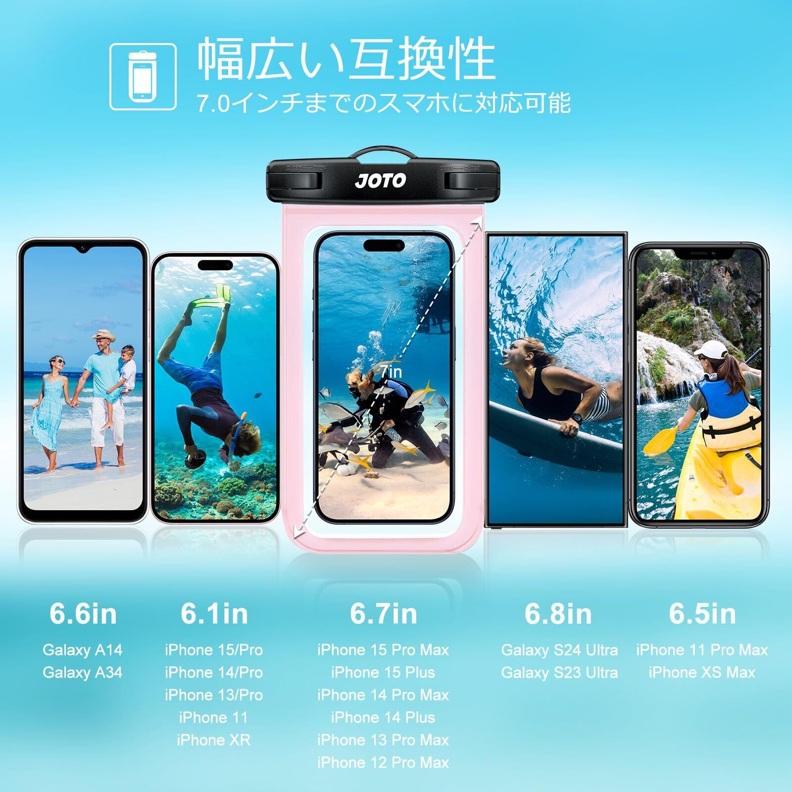 対応機種: この防水ケースはiPhone 17 Pro Maxを含む7.0インチ以下の全てのスマートフォンに対応します。また、85mm x 170mm(クリア部分82mm X 162mm)までのあらゆるデバイスにも使用可能です