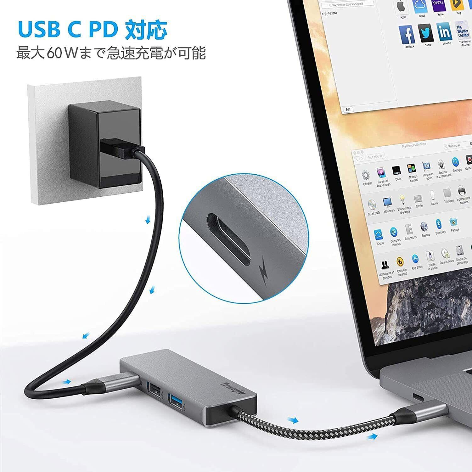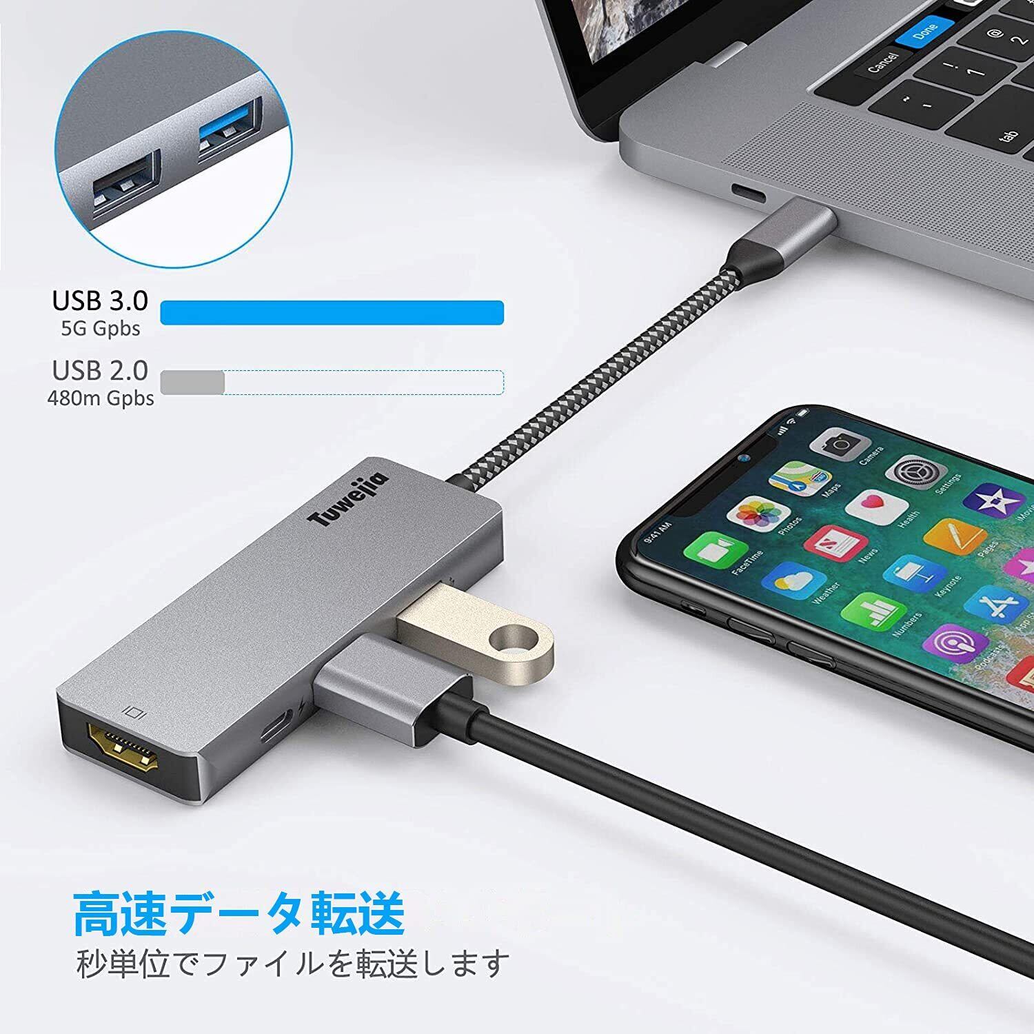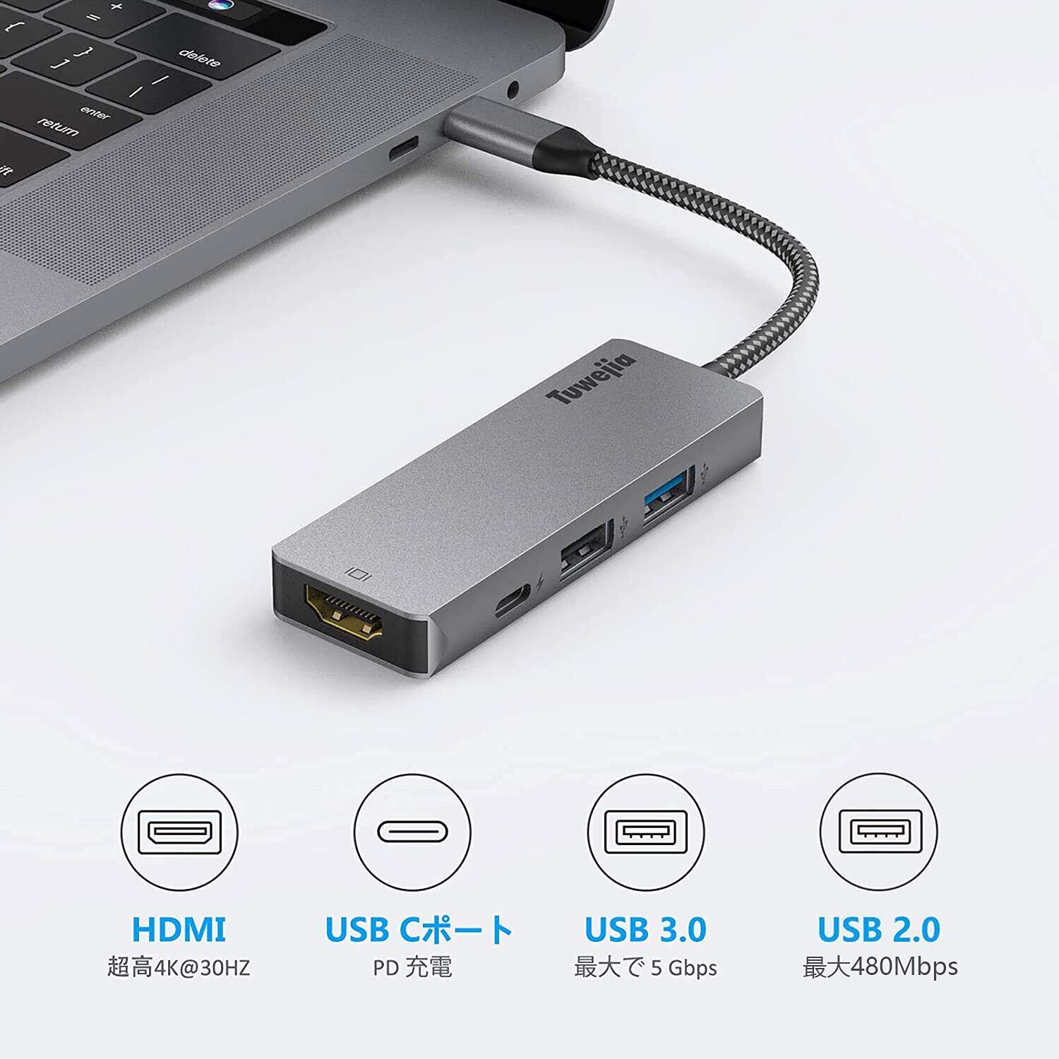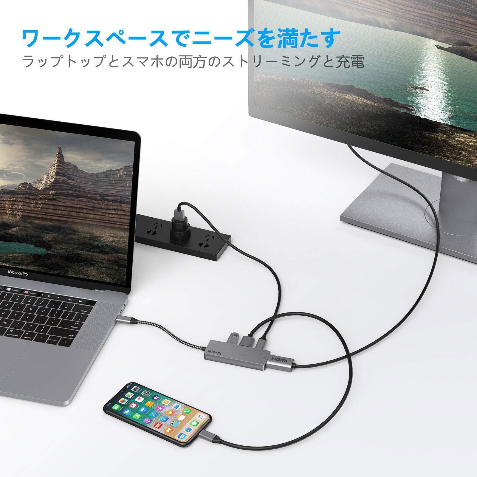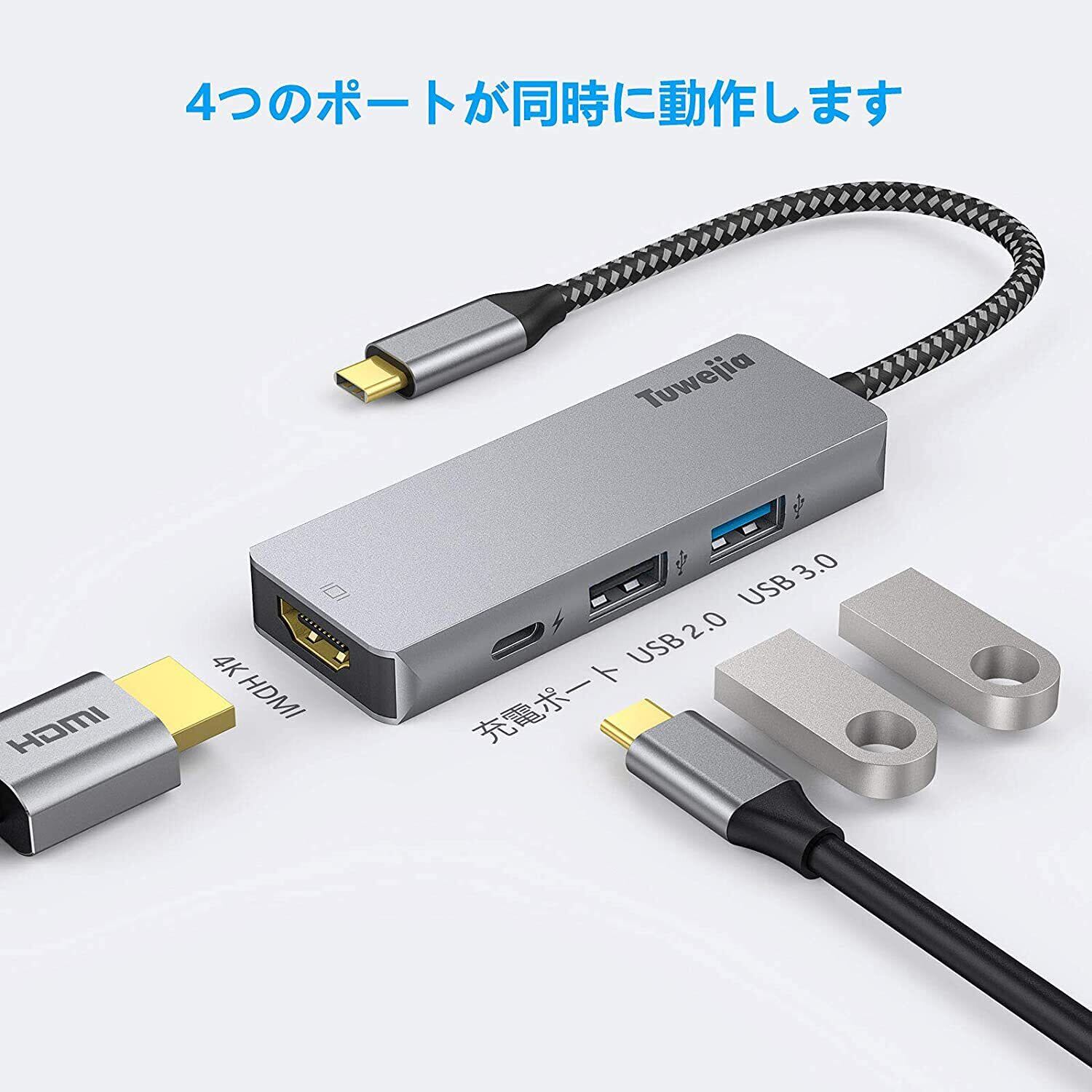 USB Type c アダプタ マルチポート Tuwejia タイプc ハブ 4K 解像度 hdmiポート+USB 3.0 データ転送ポート+usb 2.0ポート+USBタイプC急速PD充電ポート 4-in-1 変換 アダプター MacBook Pro/MacBook Air 13インチ 2025/iPad Pro 2025 Samsung Galaxy S25 など USB C デバイス対応
