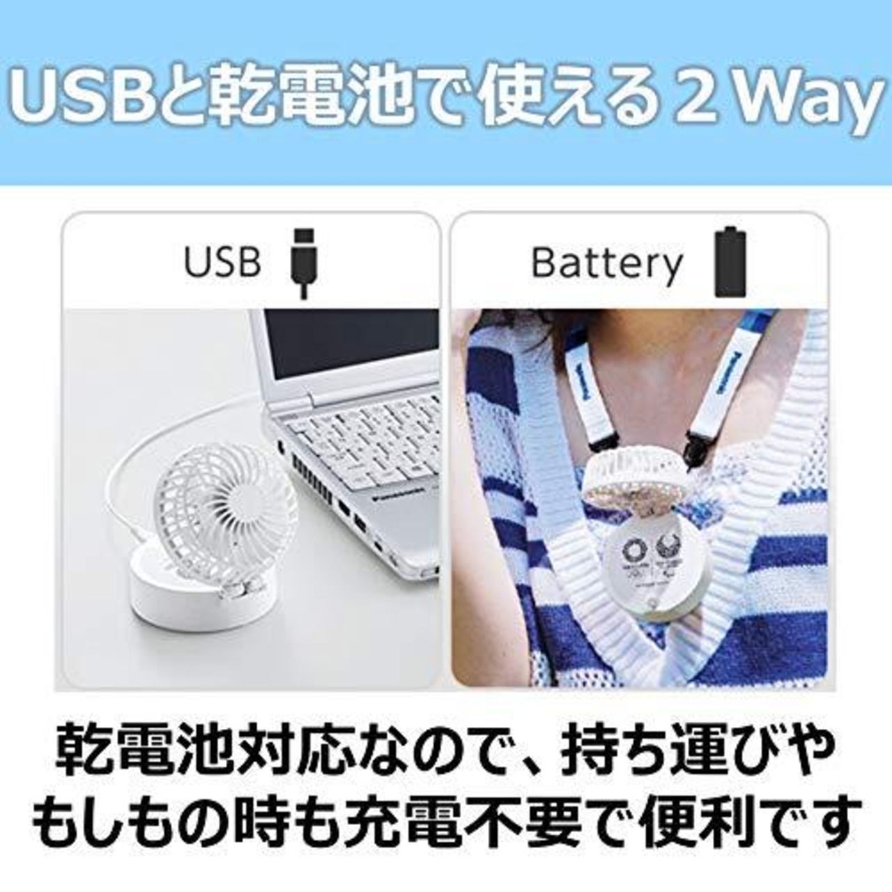 USB電源と単3形電池のどちらでも使用可能な小型扇風機