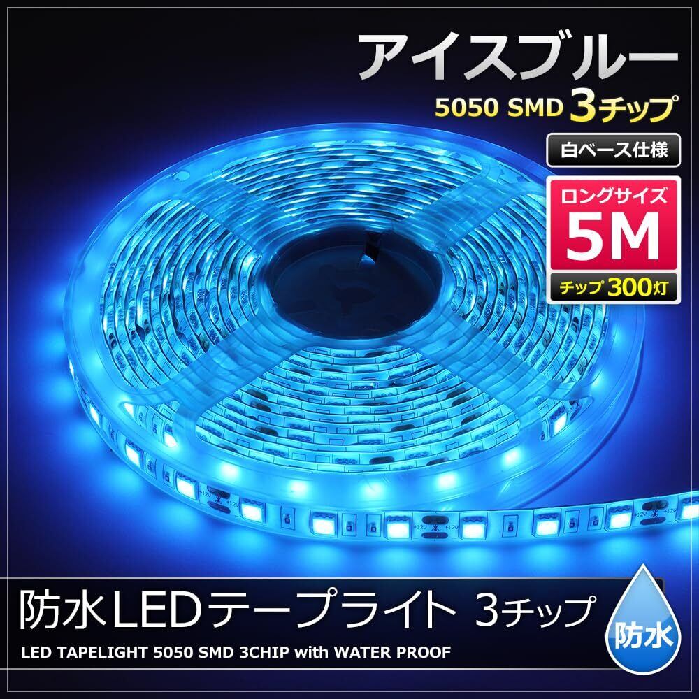 Kaito Denshi(海渡電子) LEDテープライト 車 12V 防水 車外 照明 常時点灯 正面発光 切断可能 イルミネーション 電飾 カスタム 3チップ 両端子 白ベース 5メートル アイスブルー