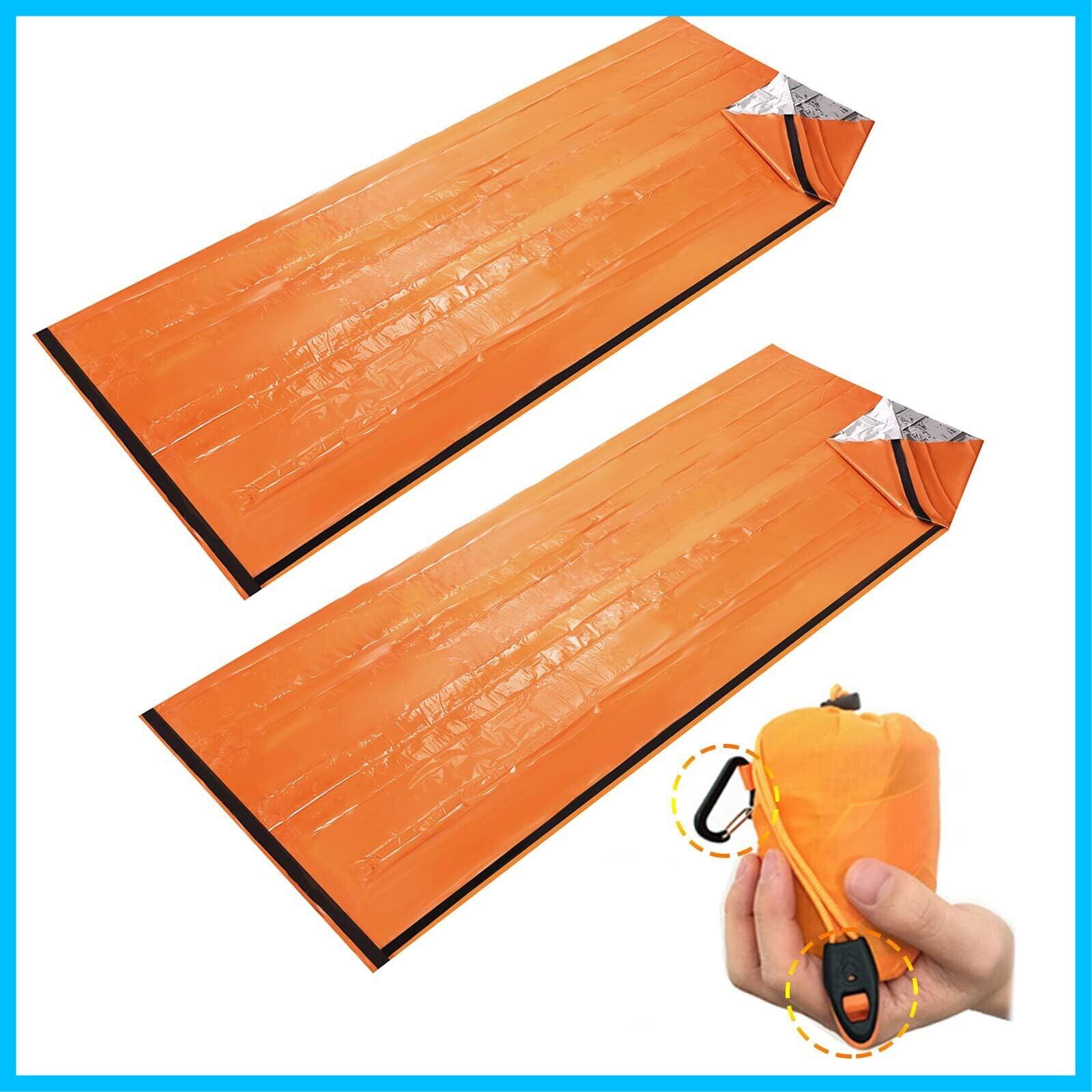 【持ち運び便利】 手のひらに乗るほどコンパクトなのに、広げると大人でも余裕ですっぽり収まる寝袋サイズになります。1つの巾着収納袋も含めて238g(2枚の寝袋入り)の超軽量なエマージェンシーシートは、カラビナも付くので、楽にバックに掛ける可能、非常時・緊急時に防災バッグ・車に常備しておく事ができます。