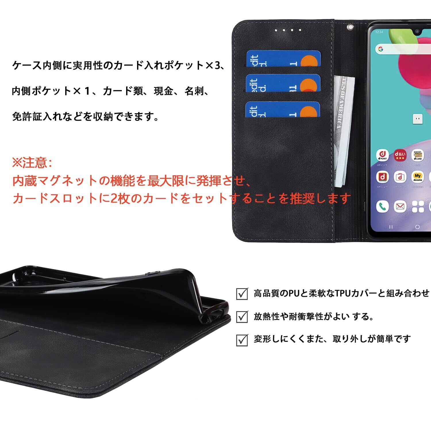 【収納機能】Galaxy A41 SCV48 SC-41Aケース内側に実用性のカード入れポケット×3、内側ポケット×1、カード類、現金、名刺、免許証入れなどを収納でき、通勤も通学にも楽々タイプです。内蔵マグネットの機能を最大限に発揮させ、カードの消磁を防ぐために、カードスロットに2枚のカードをセットすることを推奨します。