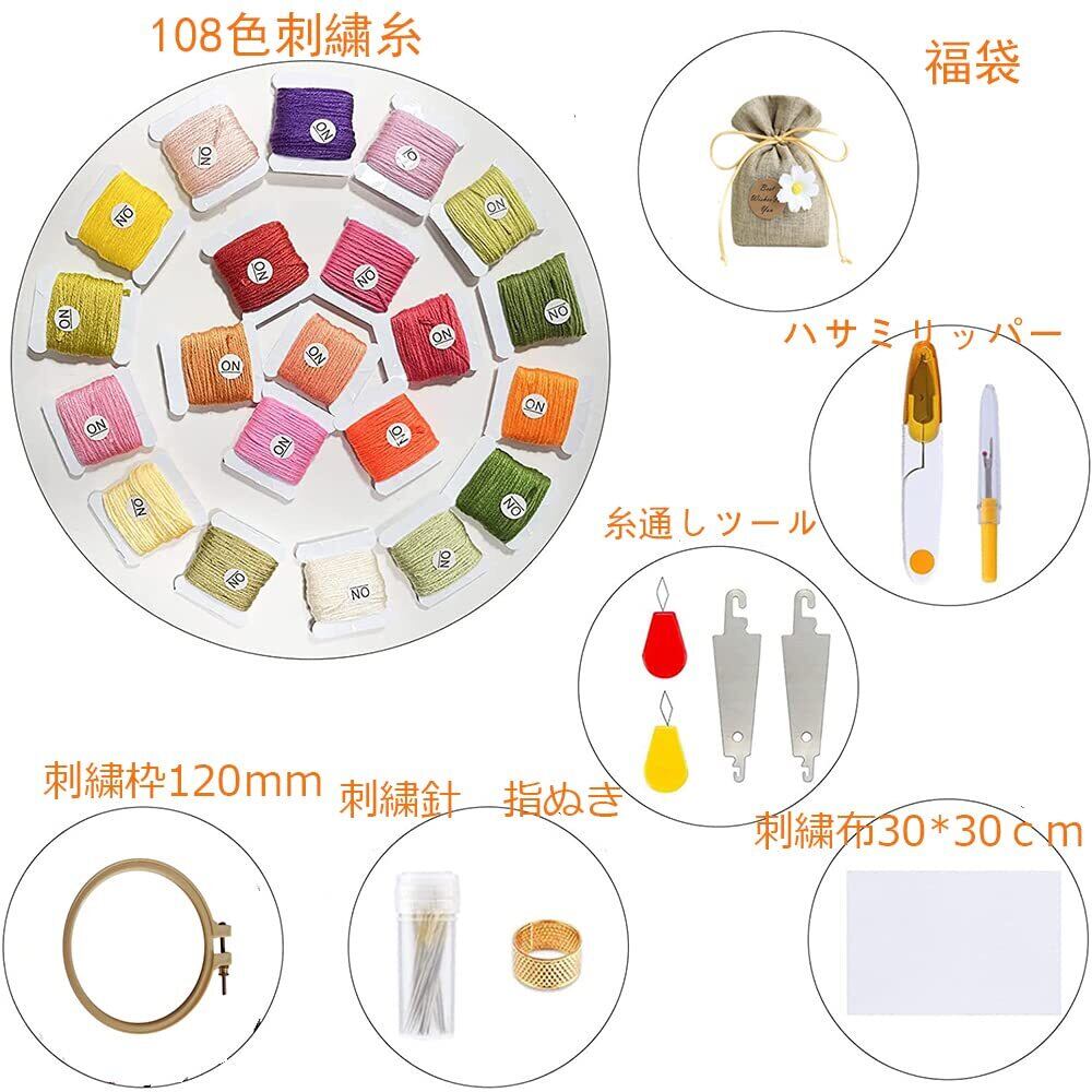 【刺しゅうキット内容】刺繍糸108色セット、ししゅう布1枚、刺繍枠1個(内径約12cm、プラチック)、刺繍針30本3種類、糸切りハサミ1個、指ぬき1個、糸通し4個2種類、リッパー1個、おしゃれな福袋おまけ1個、刺繍糸専門収納ケース1個 豊富なカラーの刺しゅう糸セットです。