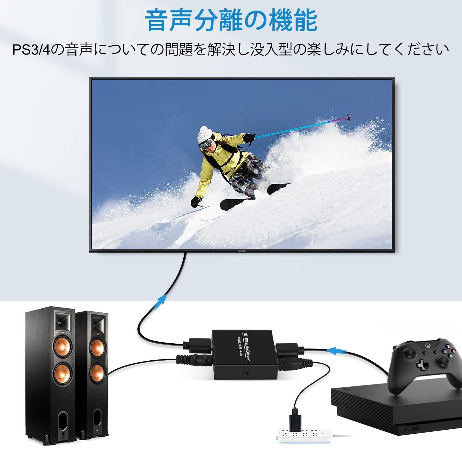 【スピーカーに接続可能】本社のhdmi audio extractorは3.5mmオーディオ独立出力をサポートします。そのため、PS3/4またはテレビのセットトップボックスを2.0スピーカーに接続して、サウンドの問題を簡単に解決し、ゲームや映画を楽しむことができます。
