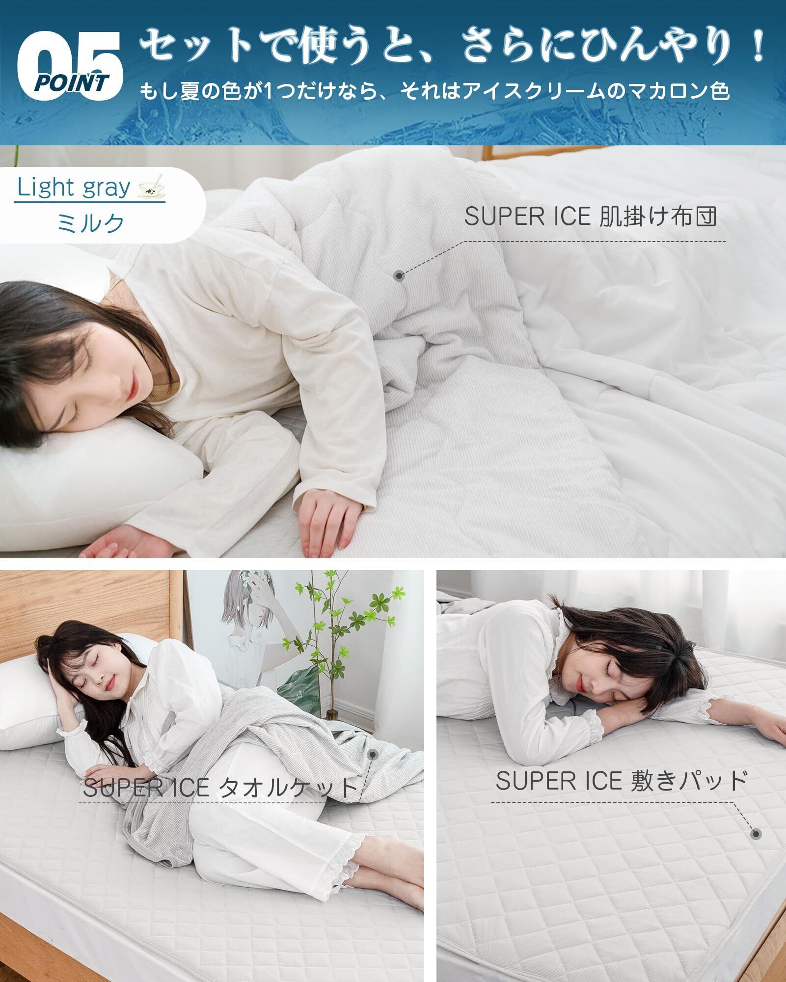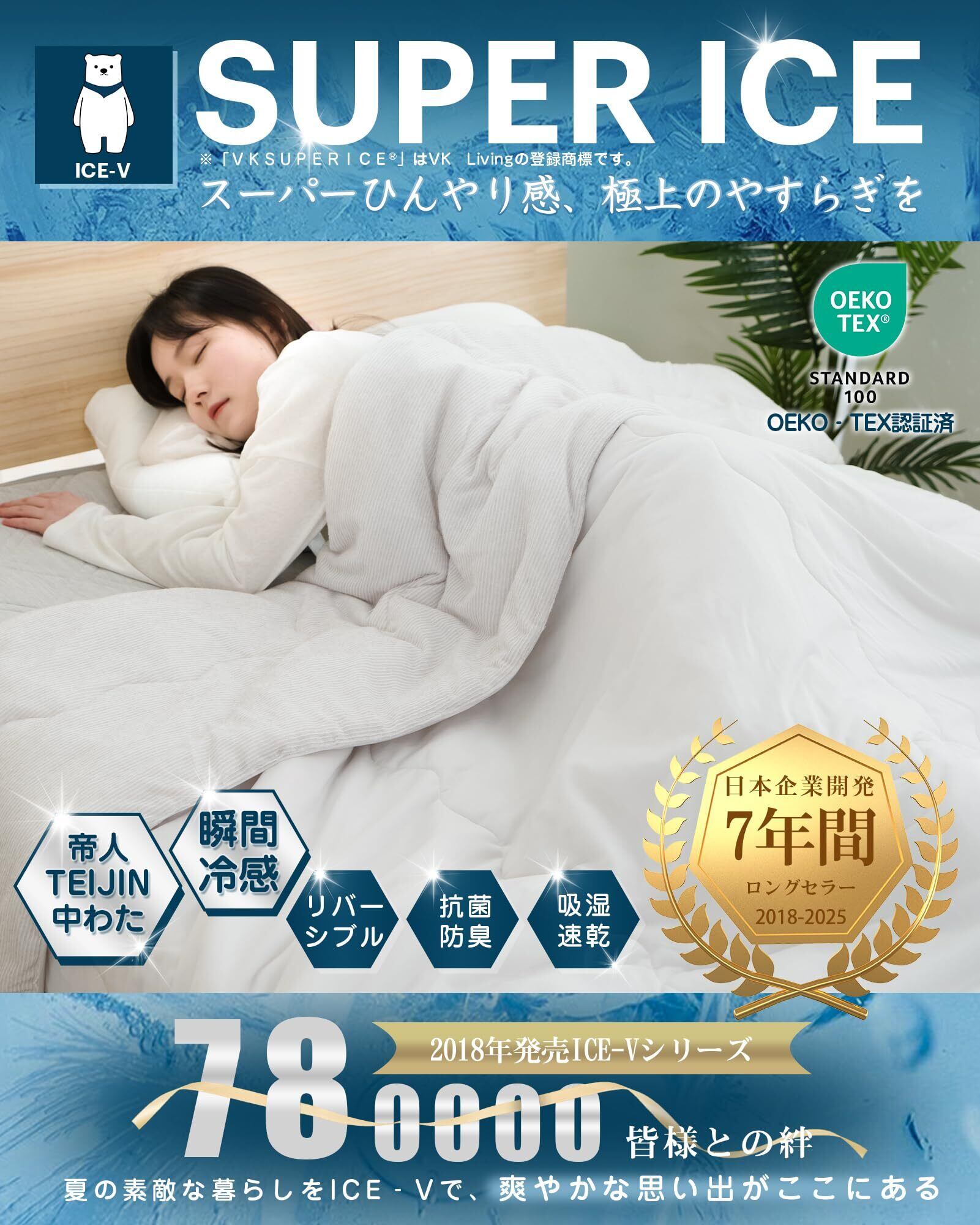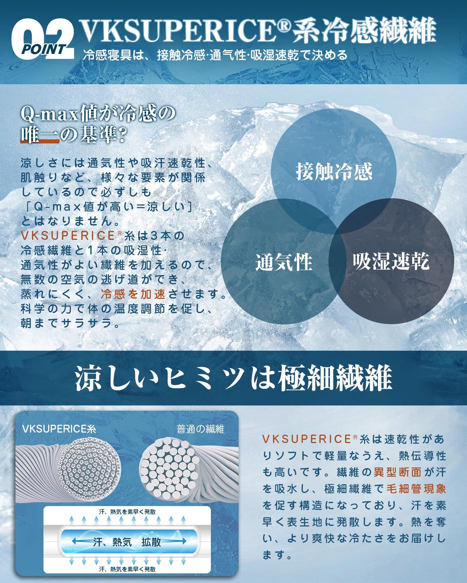【VKSUPERICE 糸冷感繊維】寝床内気候が温度33±1℃、相対湿度50±5%の範囲であれば、快適な睡眠が得られている。VKSUPERICE 糸は3本の冷感繊維と1本の吸湿性・通気性がよい繊維を加えるので、通気性に優れていて、無数の空気の逃げ道ができ、冷感を加速させます。科学の力で体の温度調節を促し、快適な寝床内気候を維持し、朝までサラサラ。