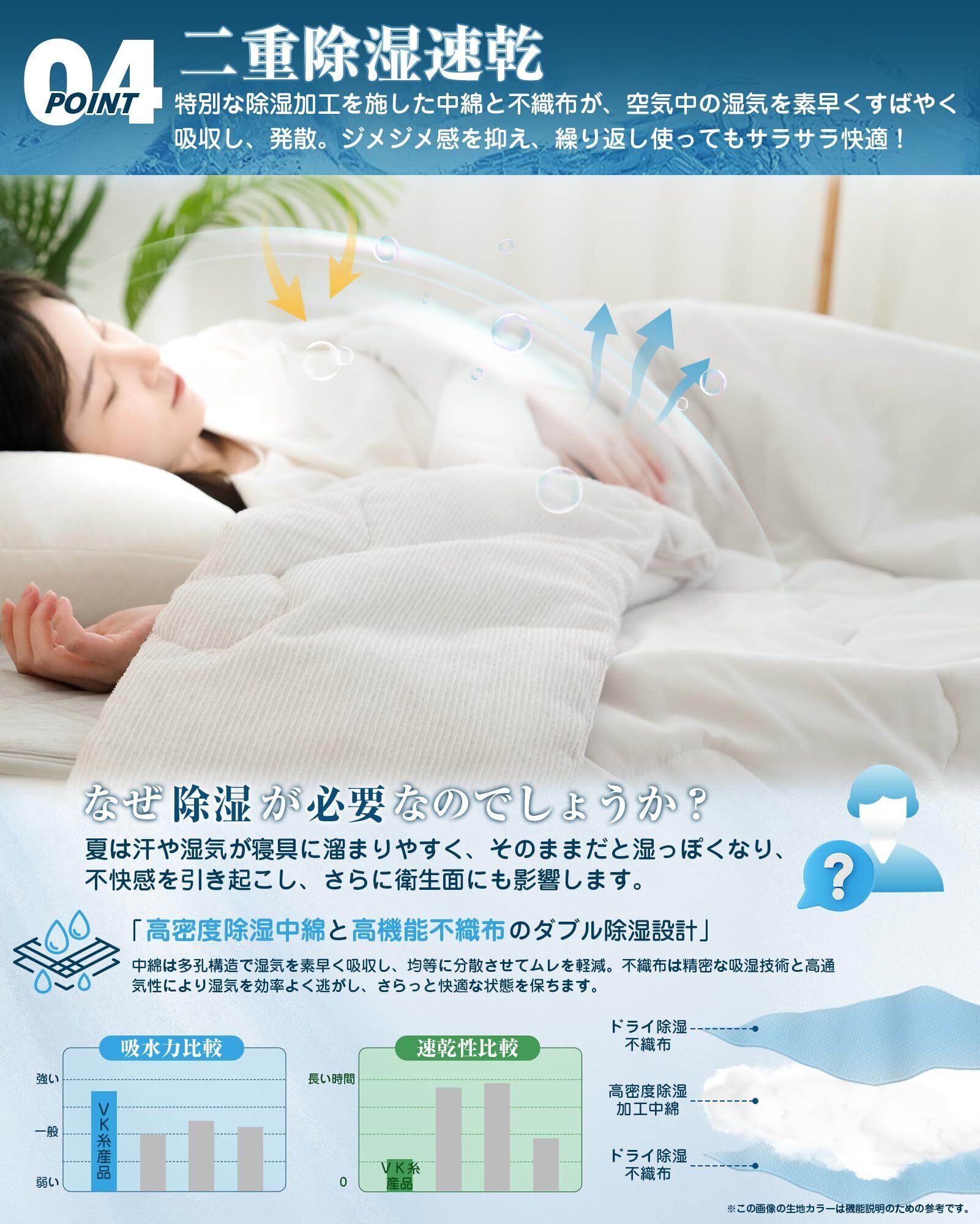 【二重除湿速乾】夏の寝苦しさは、温度だけでなく、湿気も夏の寝苦しさの要因となる。特別な除湿加工を施した中綿と不織布が、空気中の湿気を素早く吸収し、発散する。湿度を50±5%に近づけることでじめじめ感を解消、繰り返し使ってもサラサラ快適!