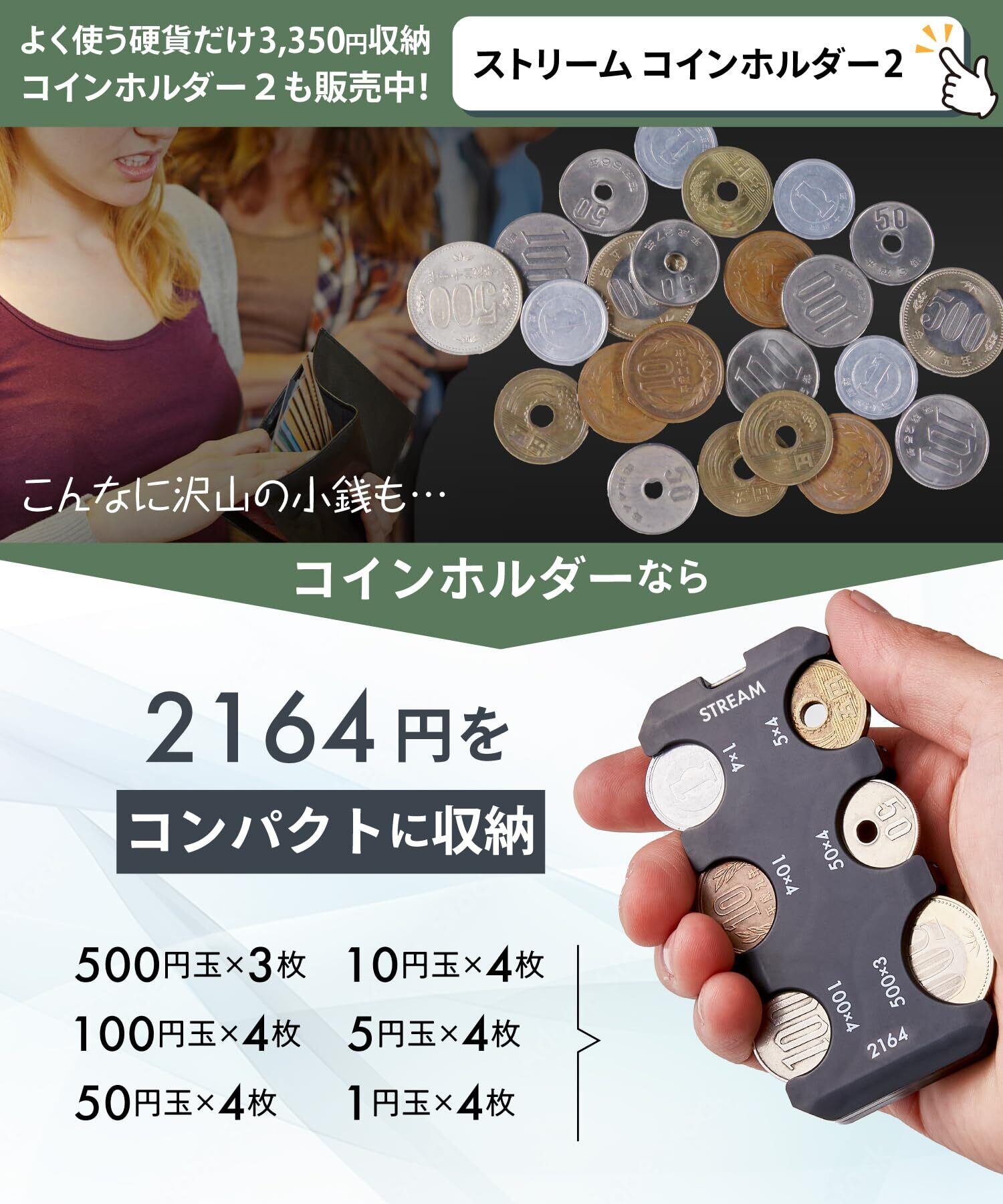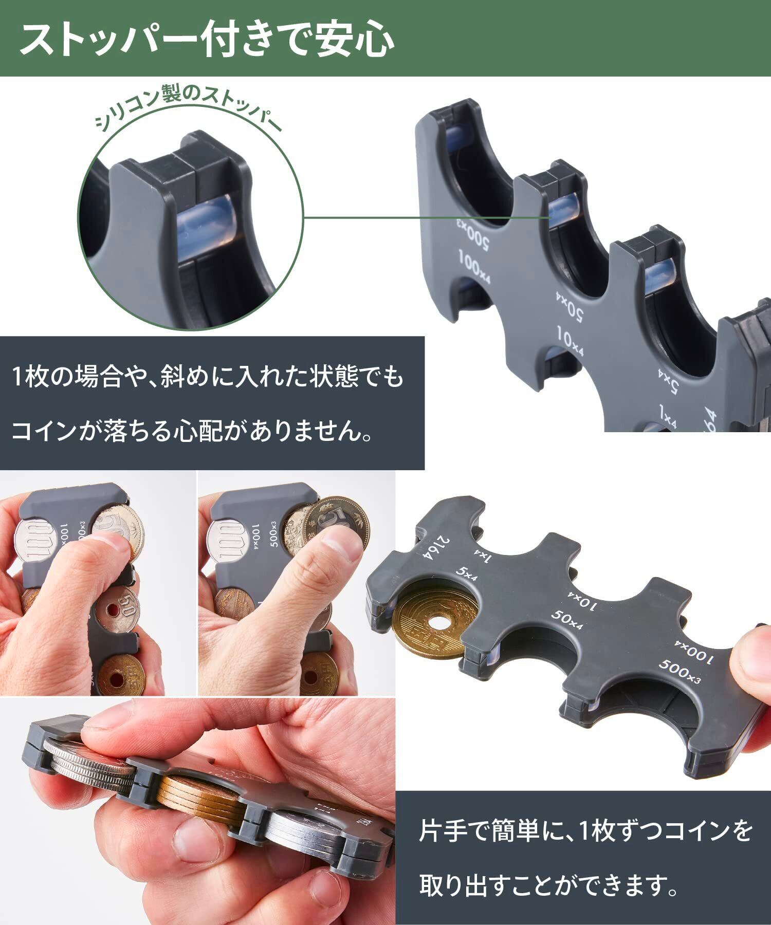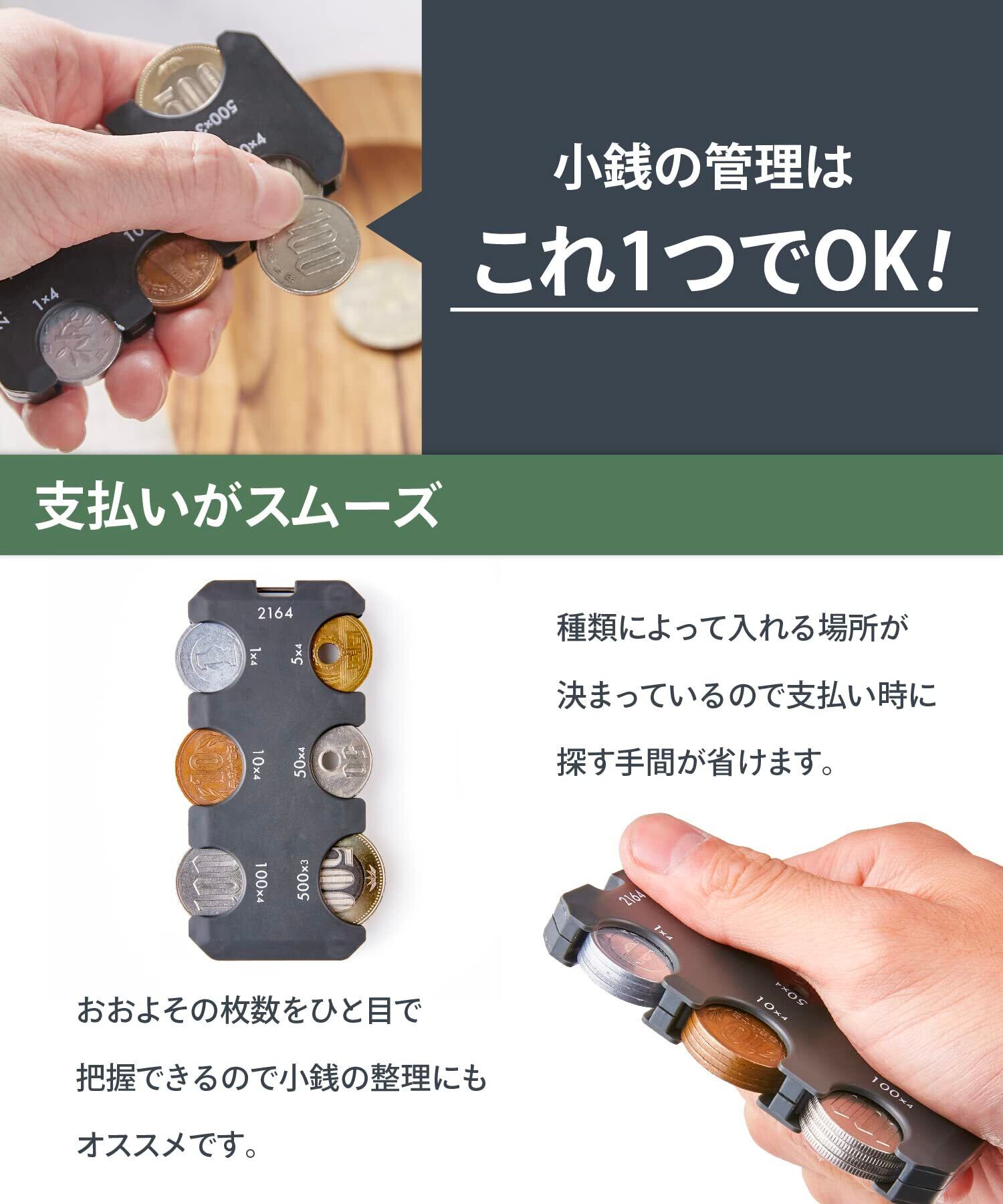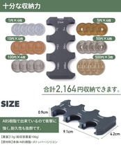 【収納量】1円×4枚・5円×4枚・10円×4枚・50円×4枚・100円×4枚・500円×3枚(合計2,164円)