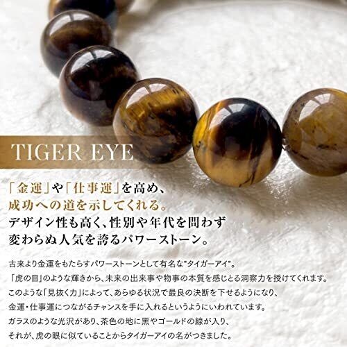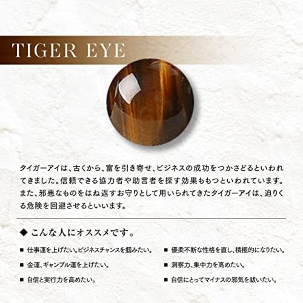 【タイガーアイとは】 古来より金運をもたらすパワーストーンとして有名です。 「虎の目」のような輝きから、未来の出来事や物事の本質を感じとる洞察力を授けてくれます。 このような「見抜く力」によって、あらゆる状況で最良の決断を下せるようになり、金運につながるチャンスを手に入れるようになる、という流れです。 新しく事業を立ち上げるときや、衝動買いや無駄な出費を抑えるなど人生のお金に対する転機に有効な石と言えます。 また、タイガーアイは恐怖心や不安といったネガティブな感情を抑え、揺るぎない心の強さも与えてくれます。 ガラスのような光沢があり、茶色の地に黒やゴールドの線が入り「シャトヤンシー(光線状)」と呼ばれています。 それが、虎の眼に似ていることからタイガーアイの名がつきました。
