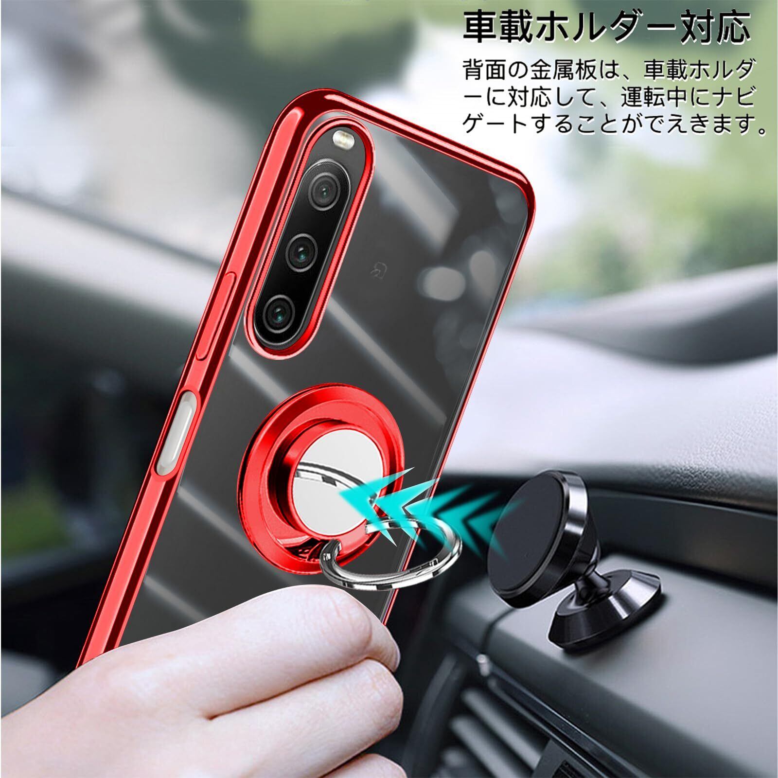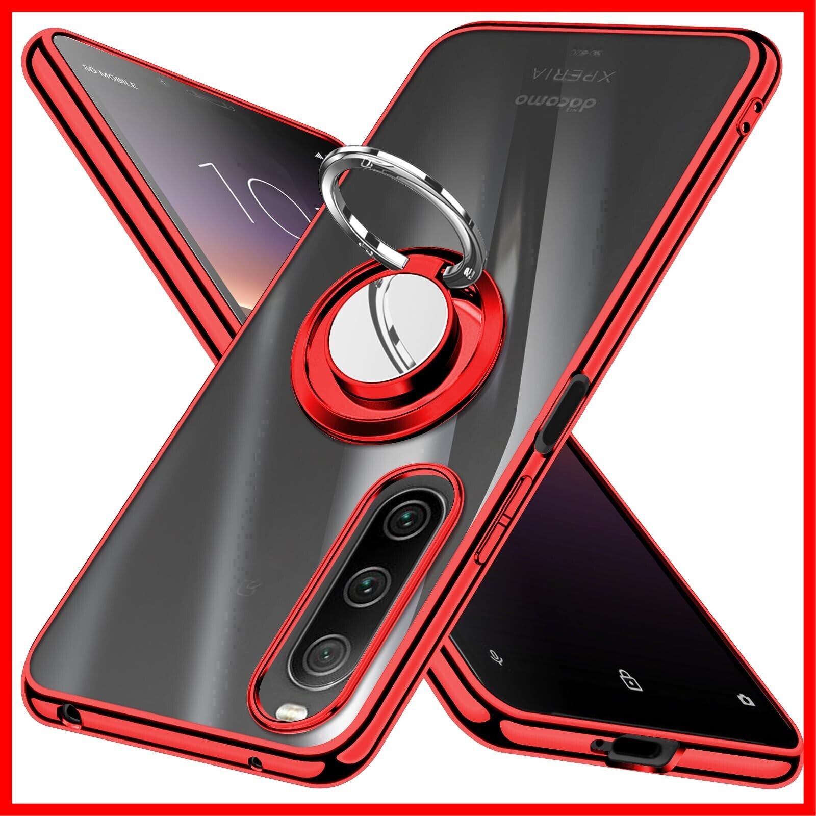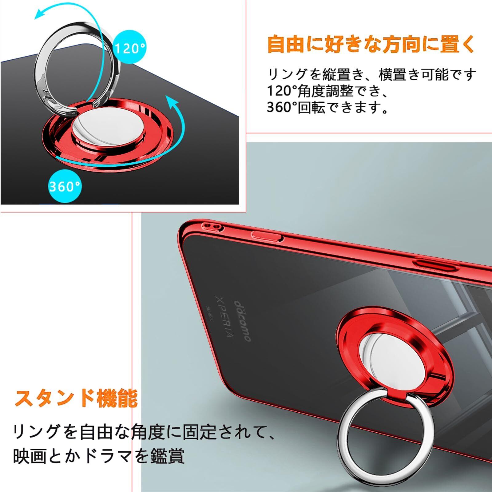 Zabarsii Xperia 10 II 用の ケース リング クリア TPU 耐衝撃 透明 赤 メッキ加工 SO-41A スマホケース SOV43 カバー スタンド機能 車載ホルダー 360°回転 ストラップホール付き Xperia 10II 用の カバー レッド