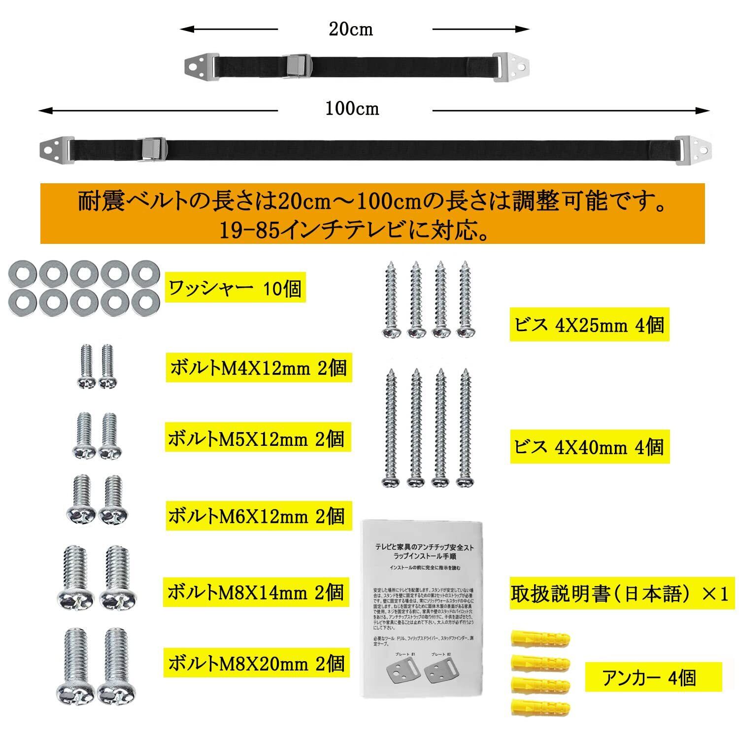 セット内容:耐震ベルト×2セッ、4X40mm 4個、4X25mm 4個、8X20mm 2個、8X14mm 2個、6X12mm 2個、5X12mm 2個、4X12mm 2個、ワッシャー x4、取扱説明書(日本語) ×1、品質保証書 ×1