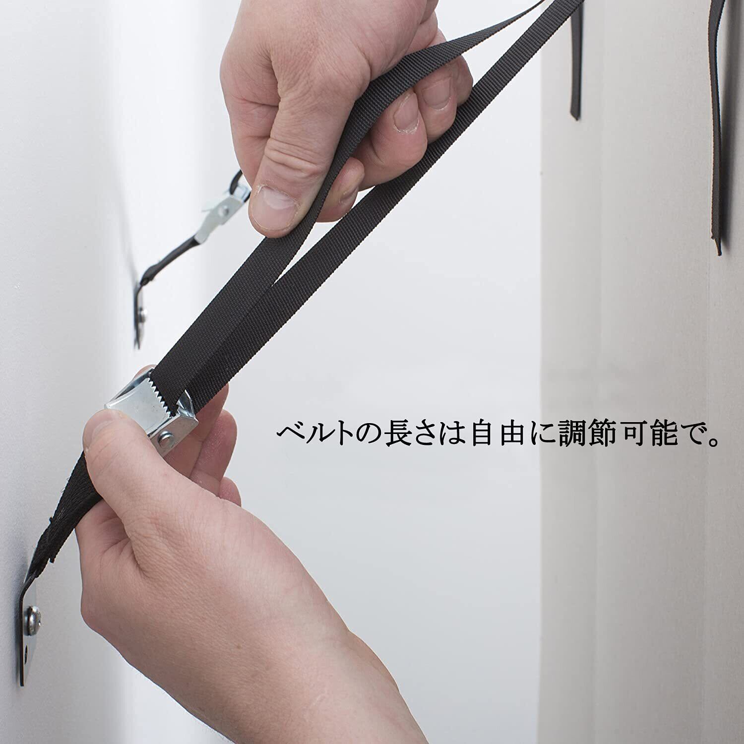 耐震ベルトの長さは20cm~100cmの長さは調整可能です。設置後、ゆるみのないようにしっかりと長さを調整することで、よりテレビをラックに固定させることができます。