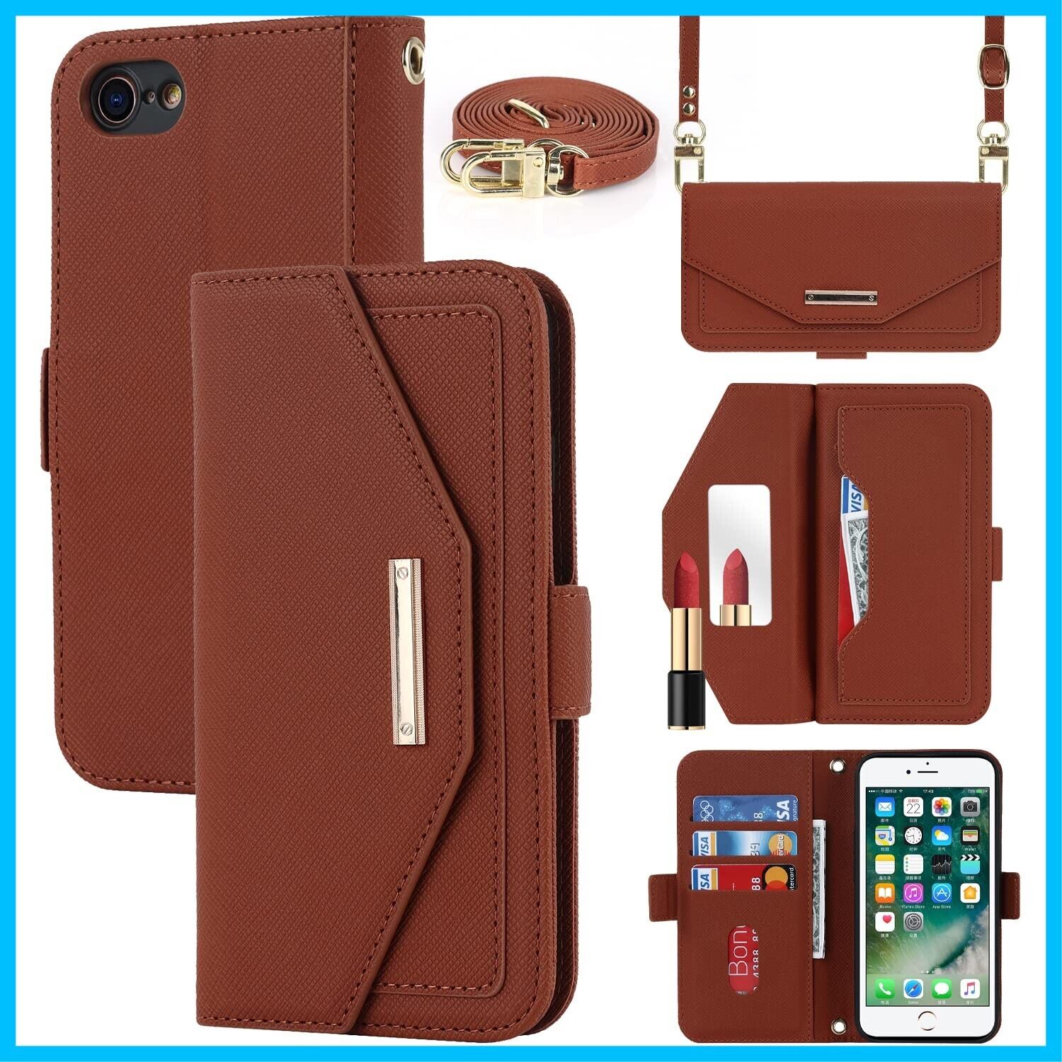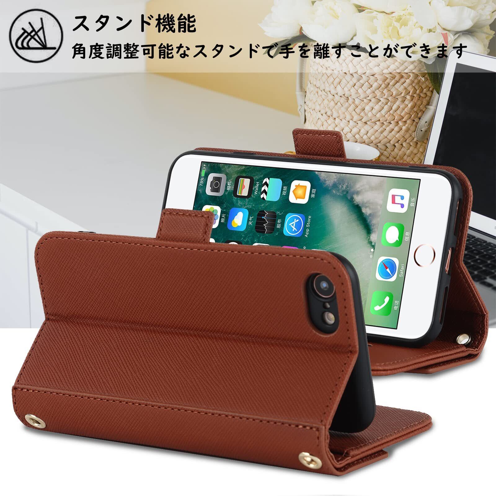 対応 iPhone se ケース ショルダー 鏡 iphone se 第3世代ケース 手帳型 iphonese第2世代 ケース ミラー 手帳型 ストラップ付き 財布 肩がけ 首掛け 斜め掛け iphone8 ケース カード収納 耐衝撃 レザー iphone7ケース カバー -茶褐