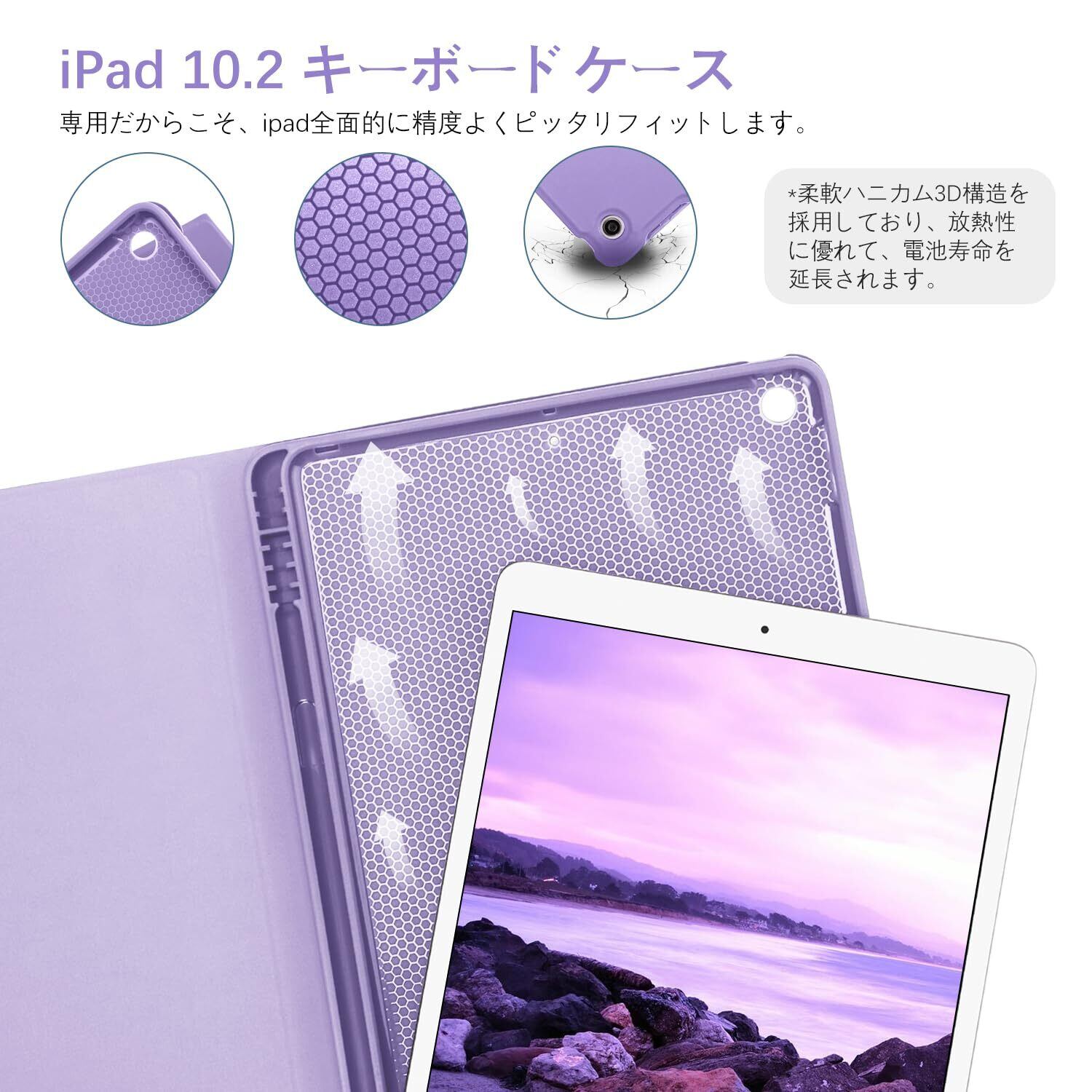 【Bluetoothキーボード+カバーでipadを守る】iPad 10.2 カバーはなめらかなゴムのようなPU製のため、手触りが抜群で、お使いのiPadが滑りにくくなり、より安心してお使いいただけます。ケース裏側には柔軟なハニカム3D構造を採用、放熱性が優れて電池寿命も延長されます。ケーブルなしのワイヤレスキーボードのキーは、パンタグラフ式構造で、打ちやすくなり、遅延せずに高精度で文字が入力できます。