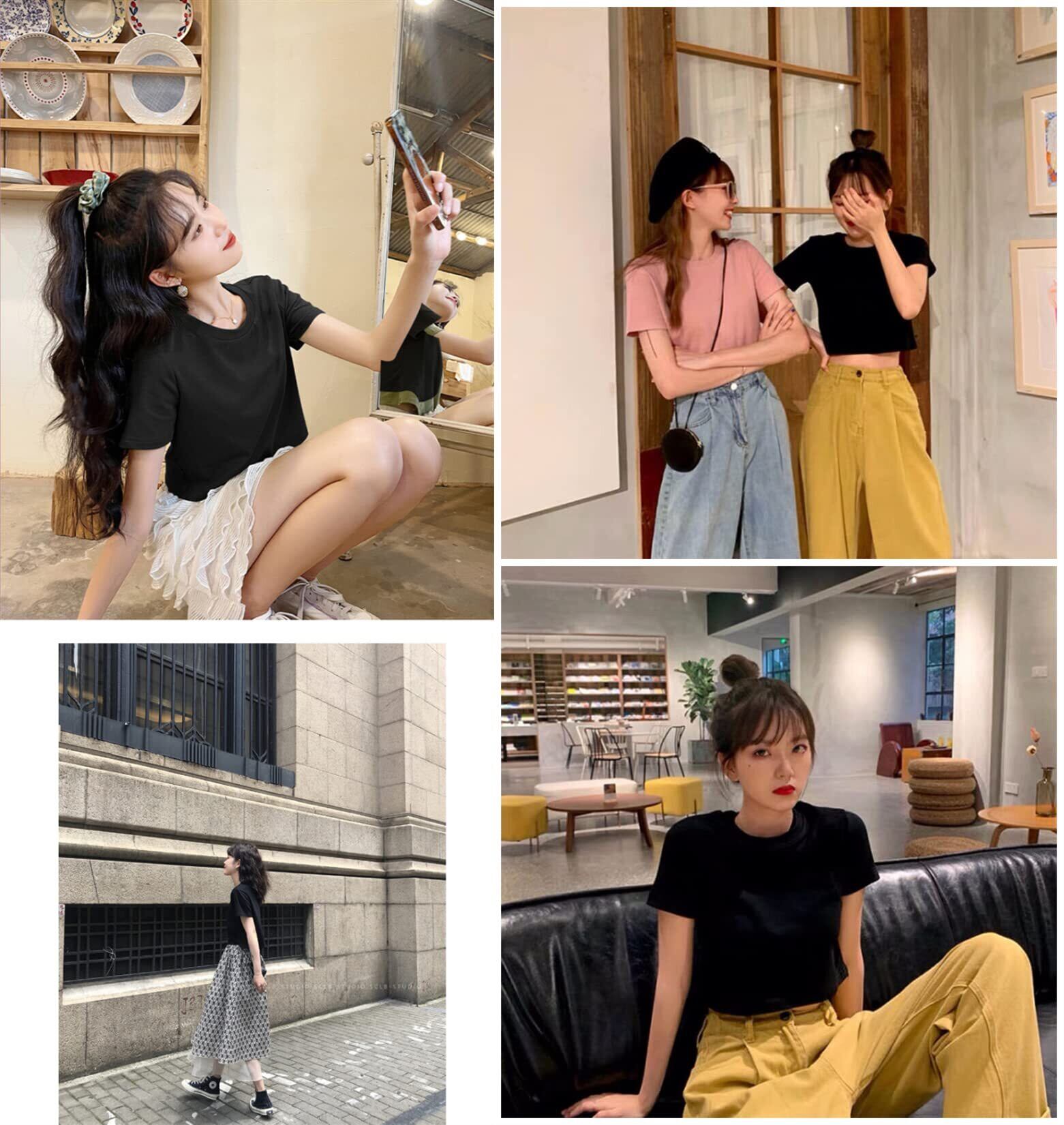 SEYIXU Tシャツ へそ出し レディース カットソー 半袖 ショート丈 Tシャツ ちびT 丸首 無地 クロップド トップス シンプル ダンス 着痩せ 半袖シャツ (ブラック)