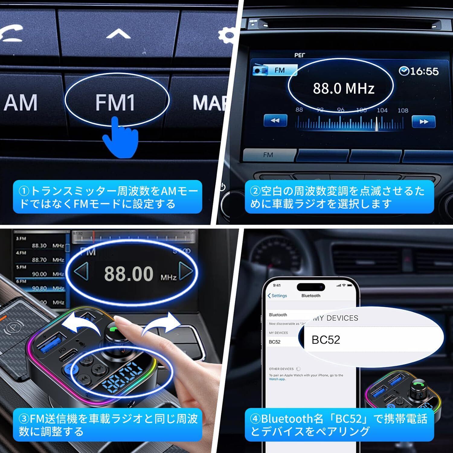 【幅広い互換性】FMトランスミッタは、iPhone、iPad、Android携帯電話、タブレット、ノートパソコン、その他のBluetooth機能を備えた音楽プレーヤーなど、ほとんどのデバイスと幅広く互換性があります。乗用車、オフロード車、バントラックなど、12-24 Vの車種に適しています。パッケージ内容:FM送信機×1、日本語取扱説明書×1。