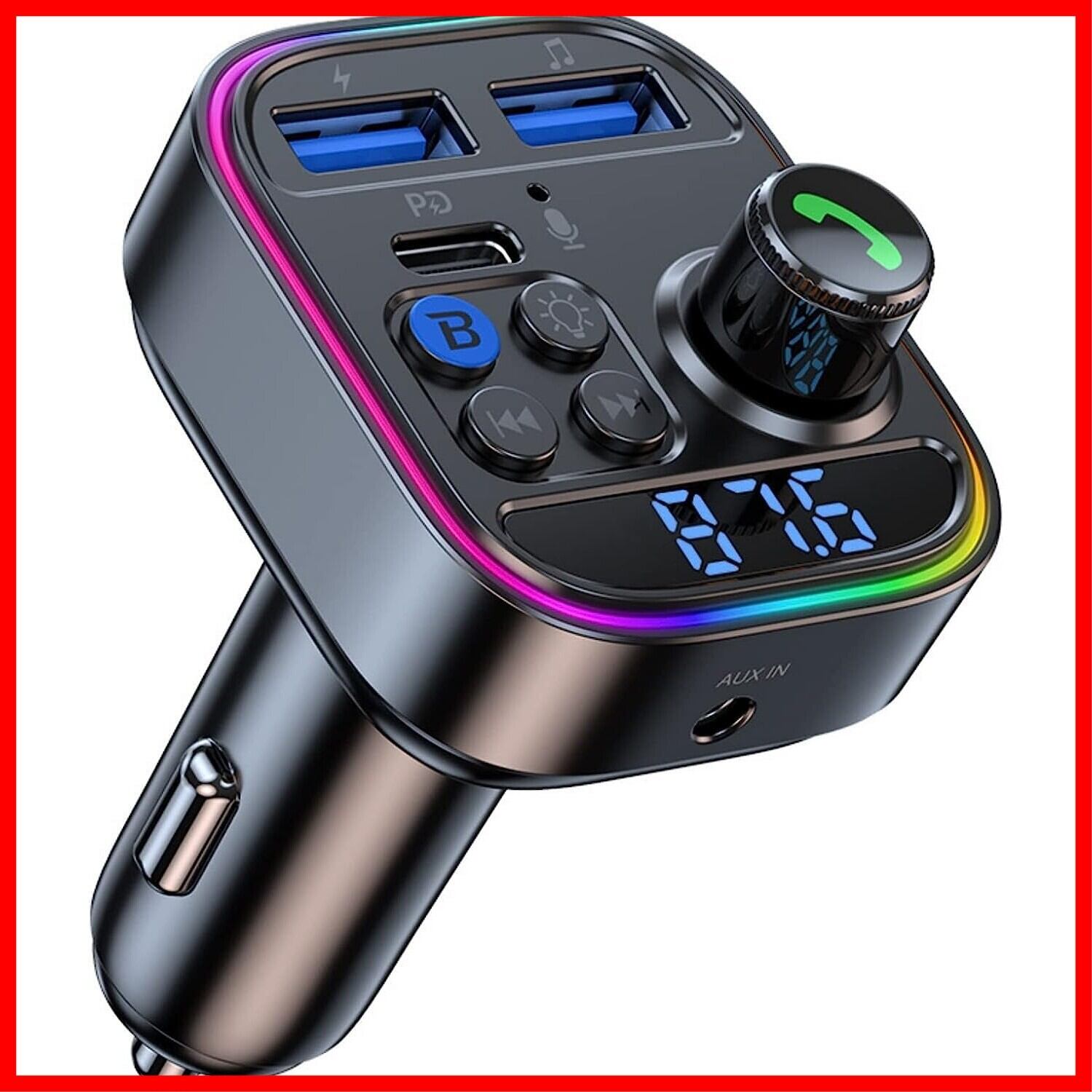 【LEDディスプレイ&LEDライト&電圧測定】周波数変調チャンネル、Bluetoothアイコン、自動車電圧を表示し、いつでもどこでも自動車電圧の安全を監視することができるLEDディスプレイ。LEDライトも搭載しています。照明だけでなく、夜の運転中にロマンチックな雰囲気を楽しむことができます。内蔵の多重回路保護により、過電流、過電圧、過熱、過負荷、短絡、不足電圧、逆挿抜、電磁保護から自動車を保護します。