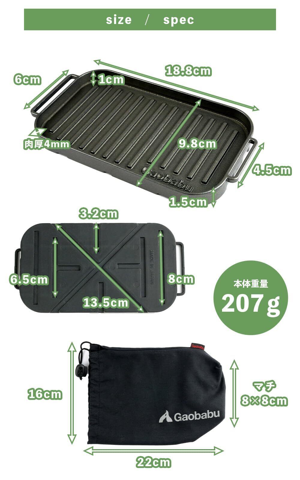 ■材質:本体 アルミニウム(肉厚4mm)※フッ素系3層焼き付け塗■材質:本体 アルミニウム(肉厚4mm)※フッ素系3層焼き付け塗装 ■本体サイズ:外寸 98mm×188mm×15mm ■重量:本体約207g ■生産国:日本製 ※メスティン1.5合用と一緒に収納出来る専用の収納袋付き