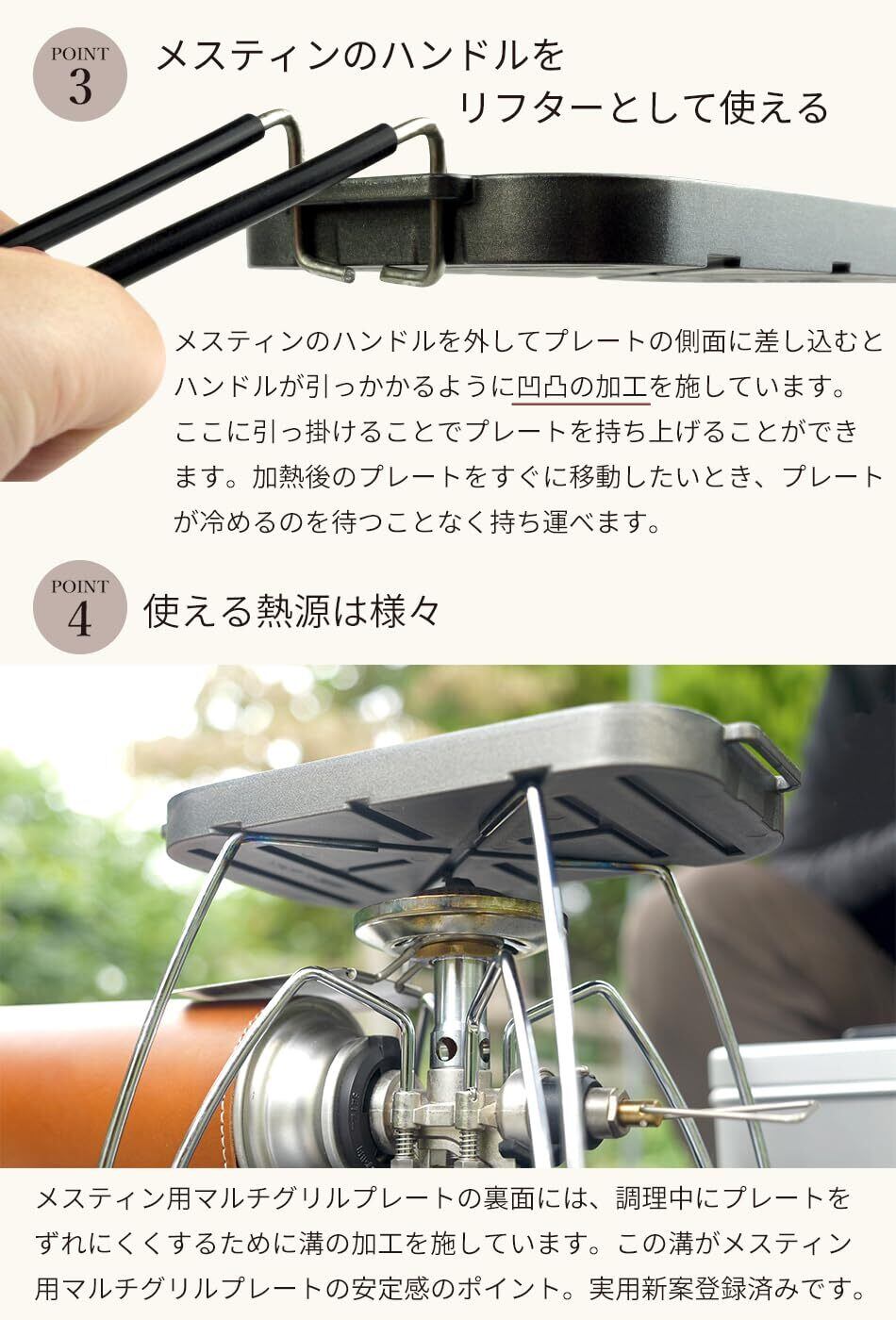 【注目ポイント】クラウドファンディングサイト「Makuake」にて大好評だった注目の商品。 マルチグリルプレートの新作 「メスティン用マルチグリルプレート」 この商品の注目のポイントはメスティンとスタッキングができることです。 プレートの重さは約207gと軽量でコンパクト。 前回より1cm縁を高くすることで調理の幅も広がりました。 メスティンを蓋にして使うことで蒸し料理も可能です。 また、メスティンのハンドルを外してプレートの側面に差し込むと、ハンドルが引っかかるように加工を施していますので、プレートを持ち上げることができます。 前回同様のフッ素コーティングでシーズニングは不要です。こびり付きにくいのでお手入れも楽ちん。裏面に各社バーナーやポケットコンロ、五徳などがフィットしてずれにくくなる加工 を施しております。 多種多様なギアがフィットする溝を作ることで、朝は静かなアルコールストーブで、お気に入りのシングルバーナーでミニBBQなど、お好みの熱源で調理ができます。実用新案登録済みです。焼く、煮る、蒸すなど お好みの調理方法でお試しください。