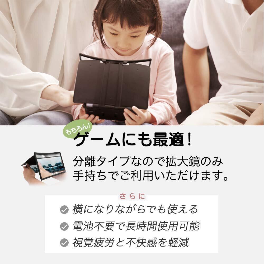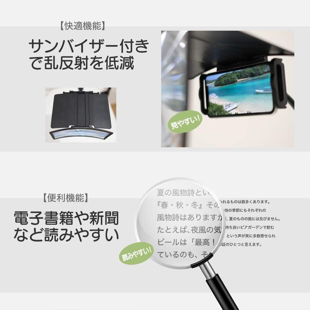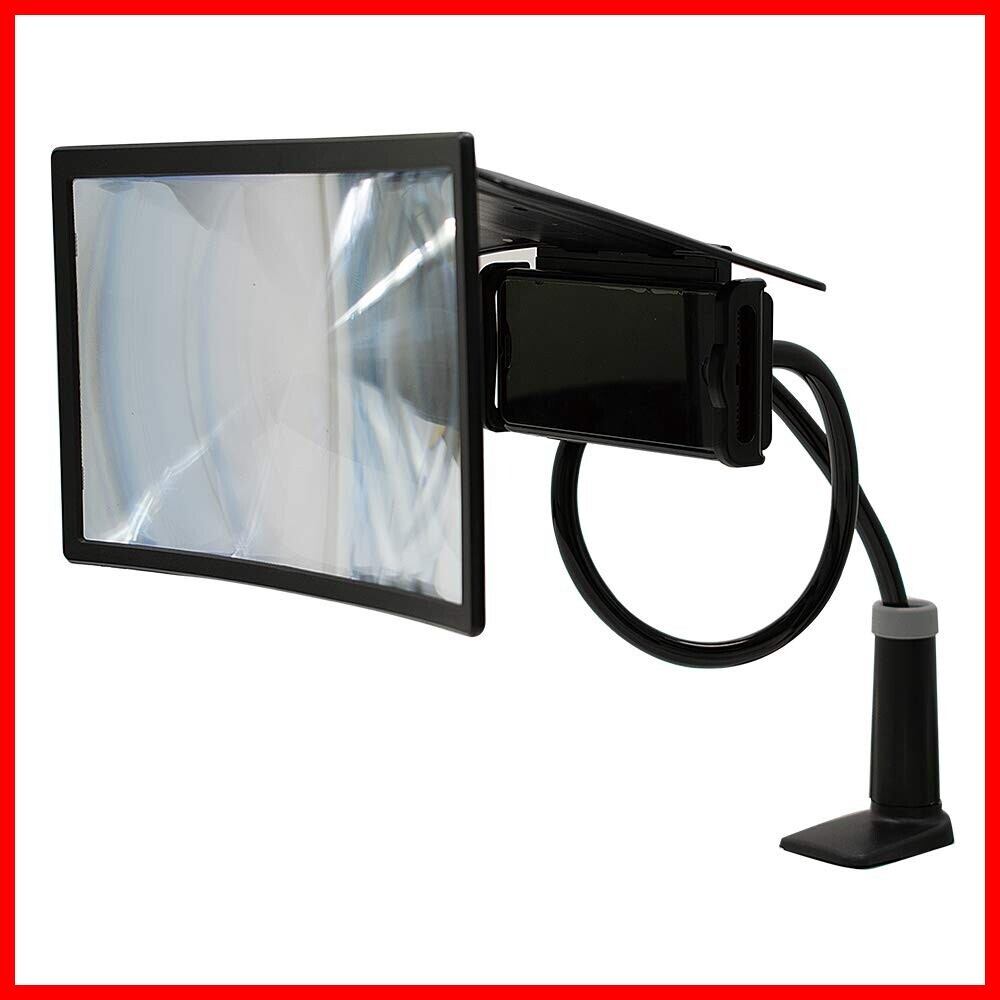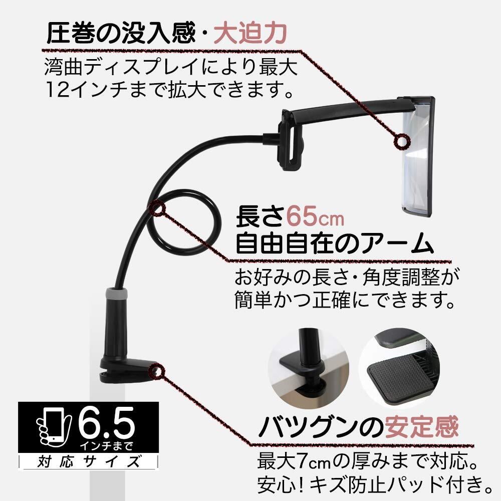 スマートフォンの画面を12インチまで拡大:6.5インチまでのスマートフォンに対応した、画面を最大12インチまで拡大することができる湾曲ディスプレイによる拡大鏡です。スマートフォン画面の乱反射を低減することができるサンバイザー付きです。そのまま手持ちで楽しんだり、アームスタンドに取り付けることでお好みの場所に固定して楽しむことができます。